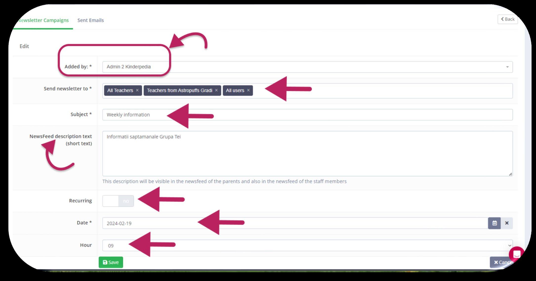 Important! The newsletter is sent by e-mail to all recipients selected in the configuration section, regardless of whether they have an activated account in Kinderpedia or not.