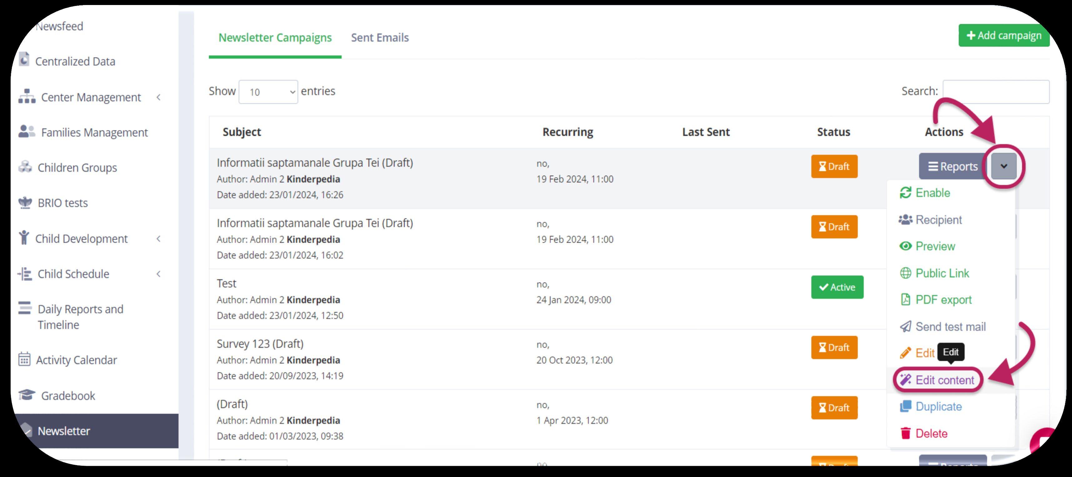 If you want to edit an existing newsletter, on the right side of the page under the "Actions" column, you just have to click on that arrow on the same row as the newsletter you want to edit and select "Edit content".