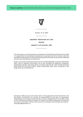 This Revised Act is an administrative consolidation of the Maternity Protection Act 1994 It is prepared by the Law Reform Commission in accordance with its function under the Law Reform Commission Act 1975 (3/1975) to keep the law under review and to undertake revision and consolidation of statute law.