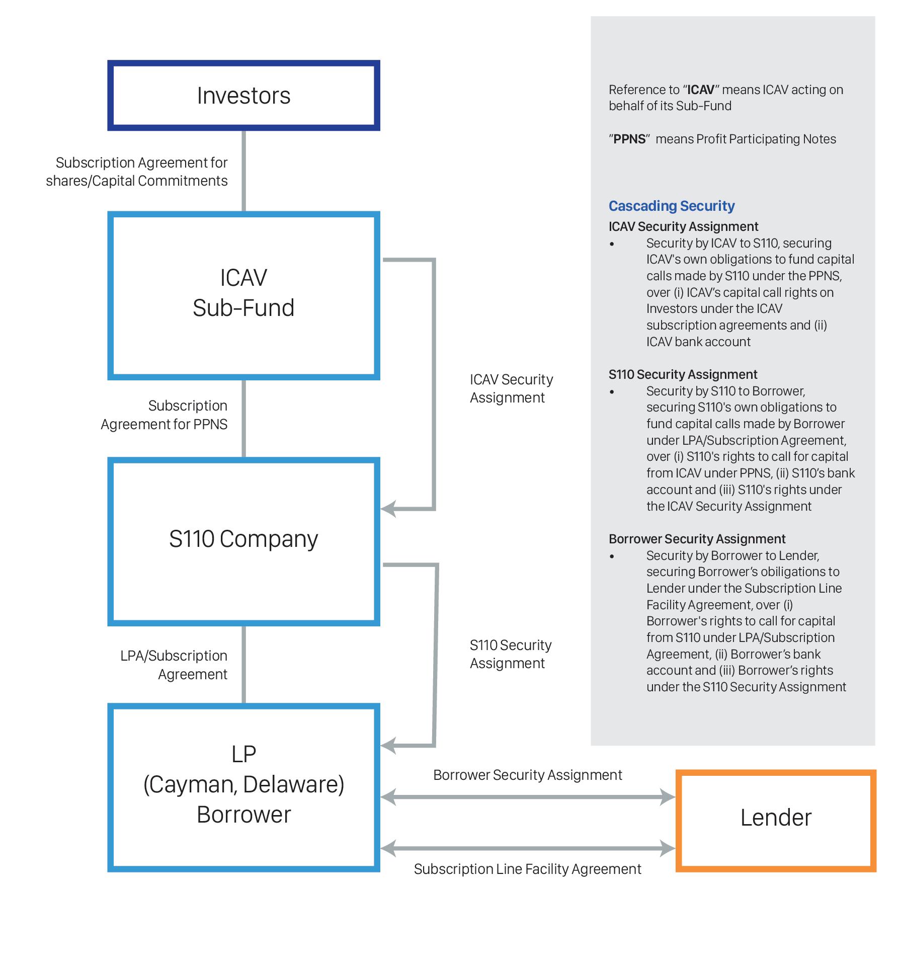 S110s issue profit-participating notes to subscribers, typically the feeder funds, and usually hold shares in an ICAV or limited partnership interests in an ILP or other foreign law governed limited partnership, which entity is usually the borrower. Therefore, it is important to understand where a S110 sits within a fund structure and to carefully check its constitutional documents in the context of considering cascading pledge arrangements over the capital calls for a subscription line financing.