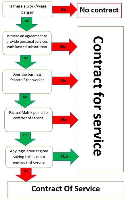 The written agreement does not specify whether it is a contract for/of employment, however, applying the framework such that 2 of the filter questions are answered negatively, it is a contract for service.