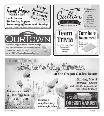 For reservations, call the front desk at 503-874-2500 879 W. Main St., Silverton oregongardenresort.com Our Town Monthly