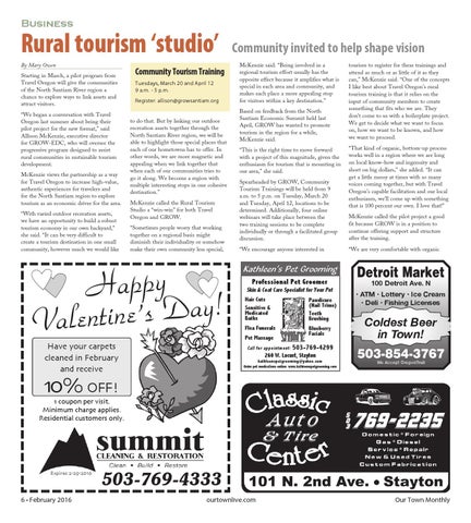 Community invited to help shape vision McKenzie said. “Being involved in a regional tourism effort usually has the opposite effect because it amplifies what is special in each area and community, and makes each place a more appealing stop for visitors within a key destination.” Based on feedback from the North Santiam Economic Summit held last April, GROW has wanted to promote tourism in the region for a while, McKenzie said. “This is the right time to move forward with a project of this magnitude, given the enthusiasm for tourism that is mounting in our area,” she said. Spearheaded by GROW, Community Tourism Trainings will be held from 9 a.m. to 5 p.m. on Tuesday, March 20 and Tuesday, April 12, locations to be determined. Additionally, four online webinars will take place between the two training sessions to be complete individually or through a facilitated group discussion. “We encourage anyone interested in