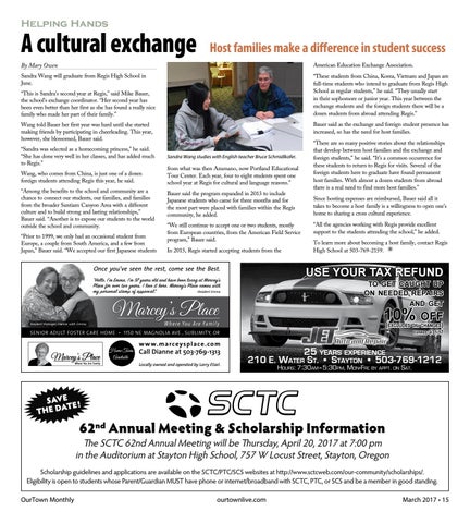 Wang told Bauer her first year was hard until she started making friends by participating in cheerleading. This year, however, she blossomed, Bauer said. “Sandra was selected as a homecoming princess,” he said. “She has done very well in her classes, and has added much to Regis.” Wang, who comes from China, is just one of a dozen foreign students attending Regis this year, he said. “Among the benefits to the school and community are a chance to connect our students, our families, and families from the broader Santiam Canyon Area with a different culture and to build strong and lasting relationships,” Bauer said. “Another is to expose our students to the world outside the school and community. “Prior to 1999, we only had an occasional student from Europe, a couple from South America, and a few from Japan,” Bauer said. “We accepted our first Japanese students