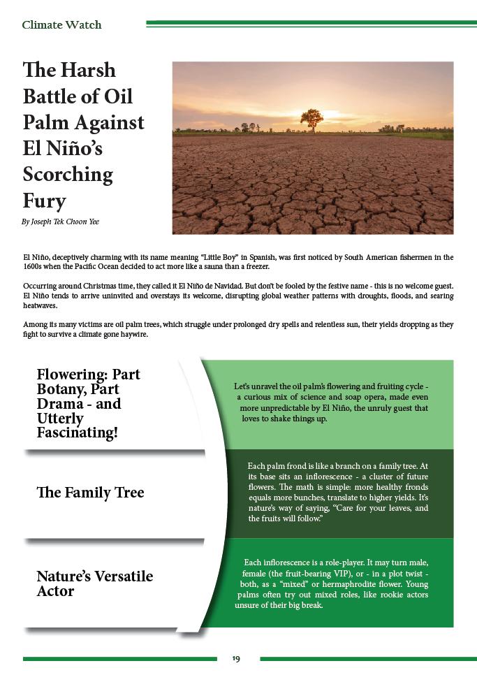 But nature doesn’t always cooperate. Environmental stressors like El Niño can wreak havoc. Under extreme stress, oil palms act like divas - owering becomes erratic and reproduction falters. e result? Lower yields and a reminder that nature plays by her own rules.