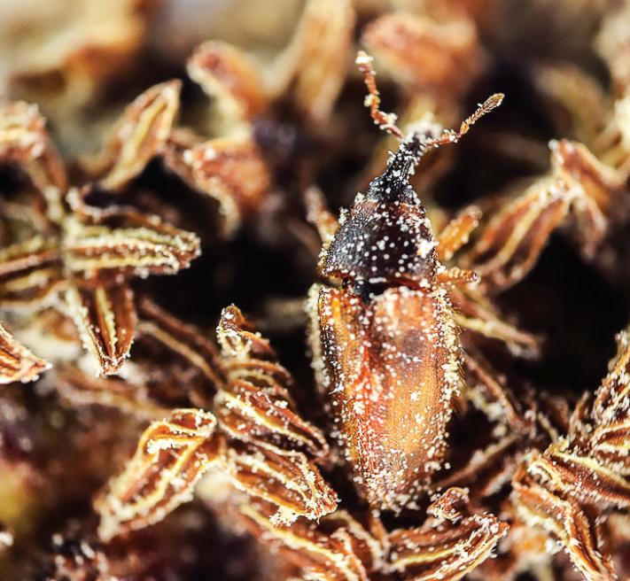 What sets them apart? Relentless e ciency. riving in dry and moderately wet conditions, these weevils wear pollen like armour, turning themselves into ying couriers of fertilisation. ey become nature’s GDEX or DHL.