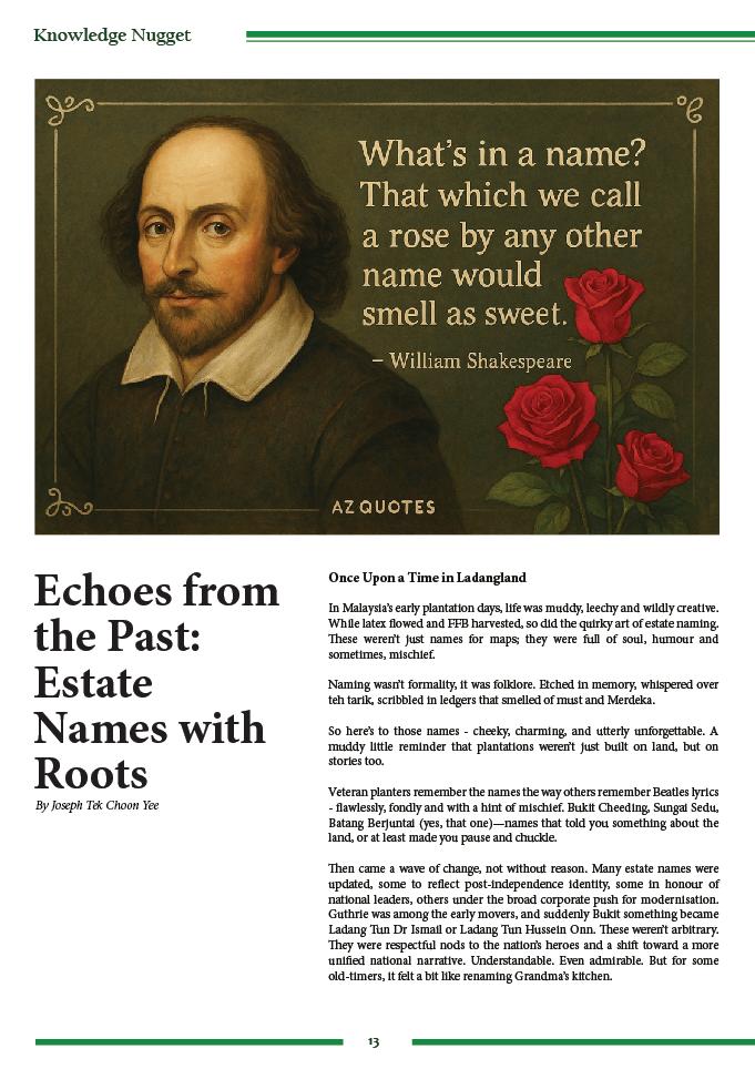 Shakespeare once asked, “What’s in a name?” On plantations, the answer was: quite a lot. Names weren’t just labels - they were love letters, acronyms, toasts, puns and the occasional sarcastic jab. Some honoured people or hometowns; others were born of brandy-fuelled banter or tongue-twisting mix-ups in multiple languages. From Tennamaram to Bangsar, Jeroco to Yam Seng, MOBE to Trushidup, they weren’t just estates - they were stories etched in latex, bunches, sweat and laughter.