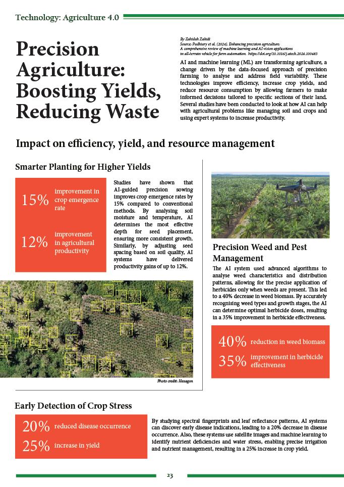 By studying spectral ngerprints and leaf re ectance patterns, AI systems can discover early disease indications, leading to a 20% decrease in disease occurrence. Also, these systems use satellite images and machine learning to identify nutrient de ciencies and water stress, enabling precise irrigation and nutrient management, resulting in a 25% increase in crop yield.