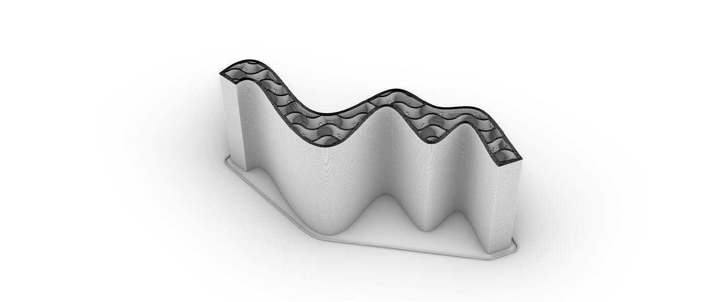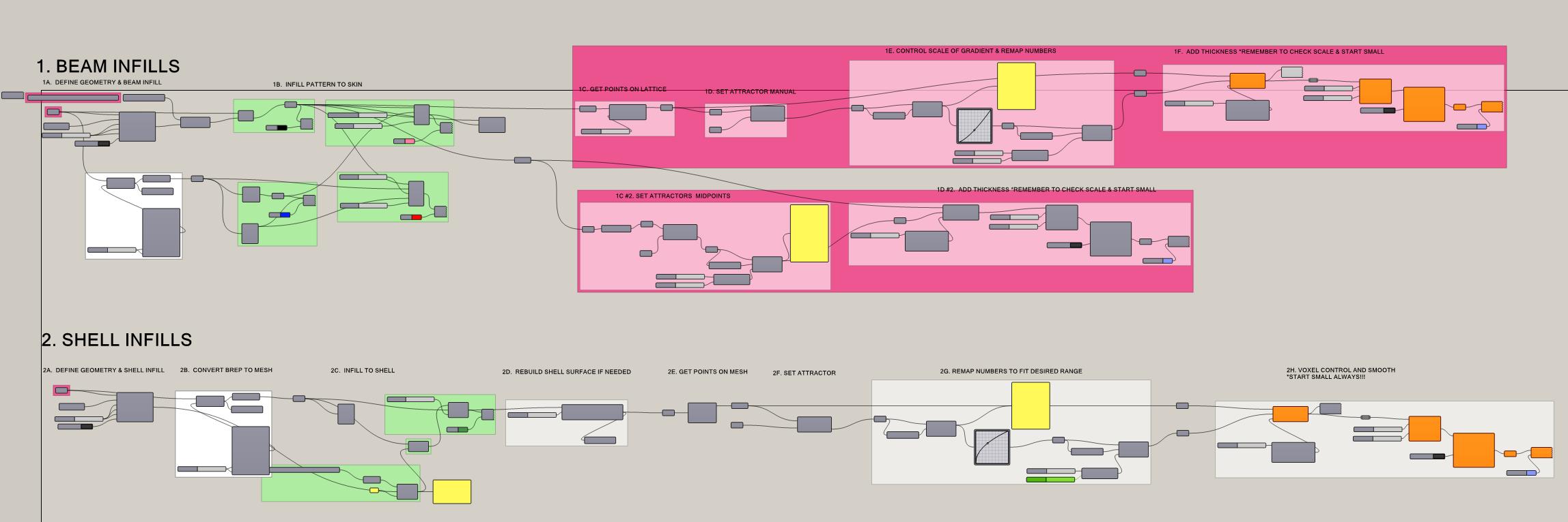 Once completing the infill prints we began exspirimenting with parametric design using grasshopper. This software allows up to create the organic and geometric shapes above. Giving the program parameters that we can manipluate makes it possible to create gradients as seen in figure 4. Using to scripts one for beam infills and one for shell infills
