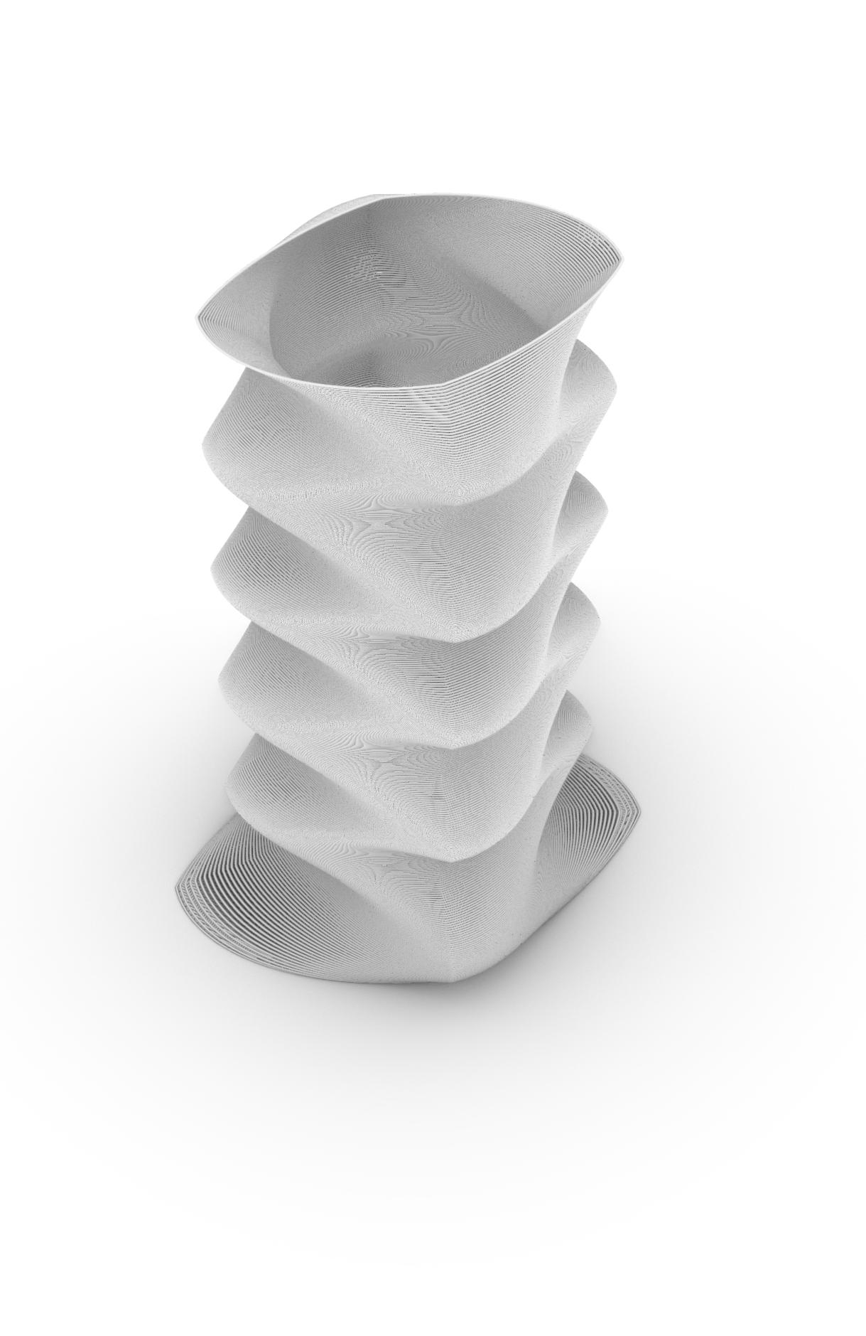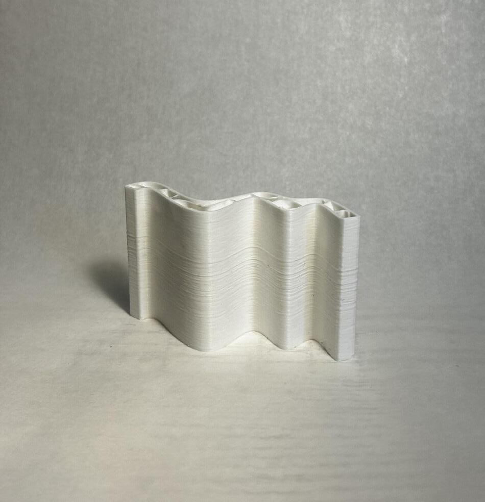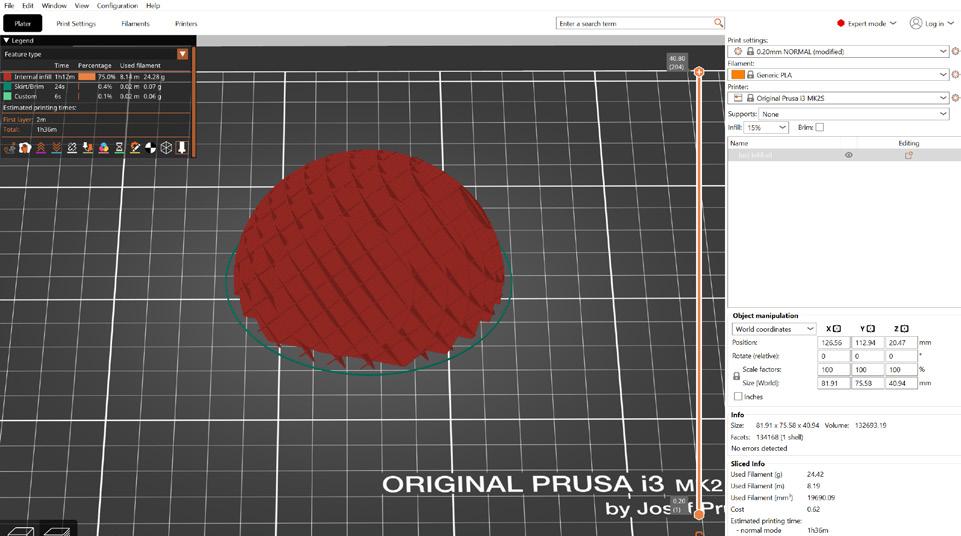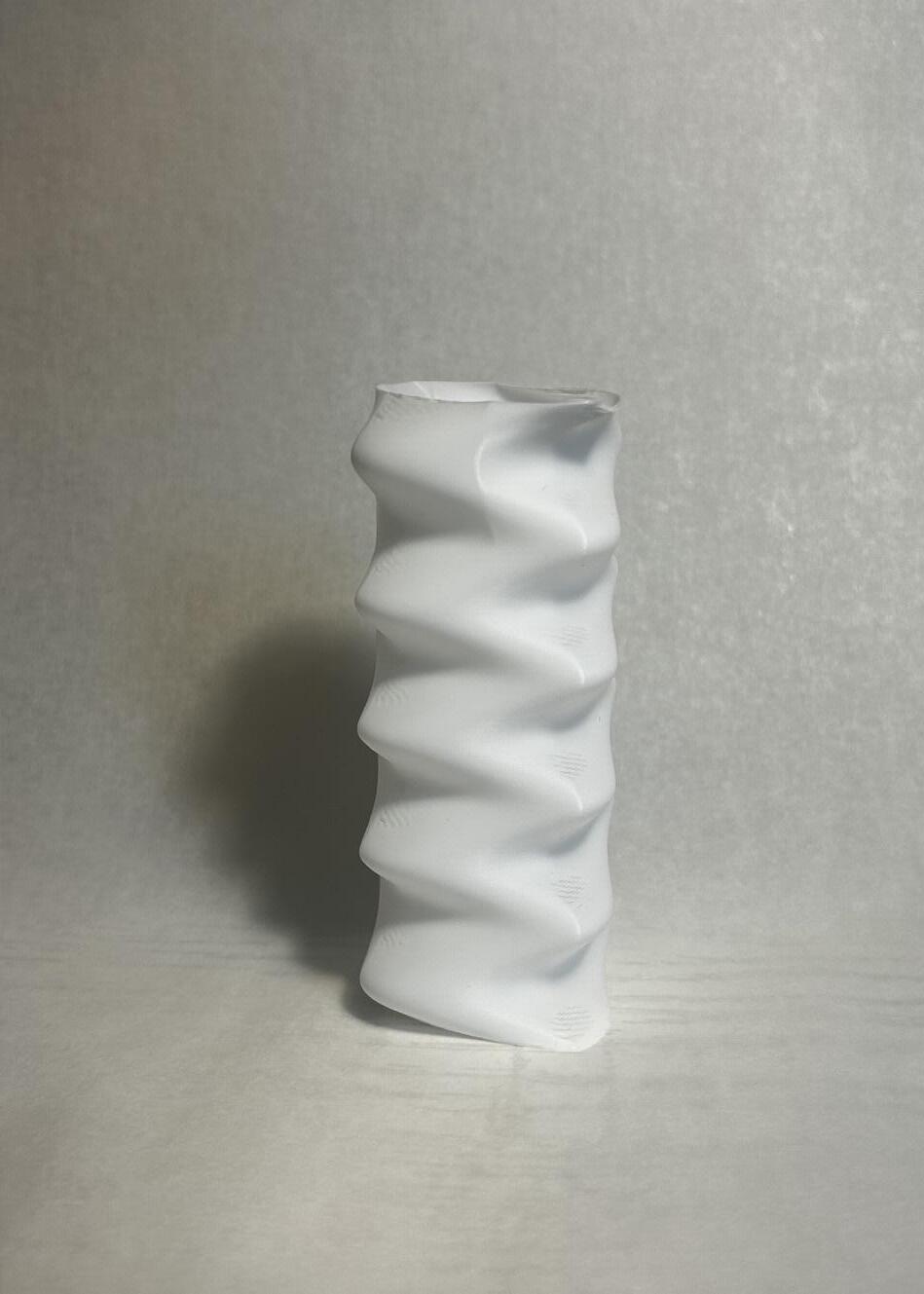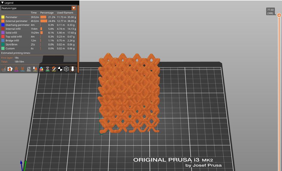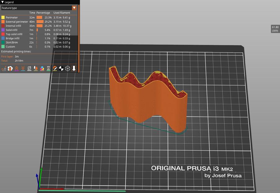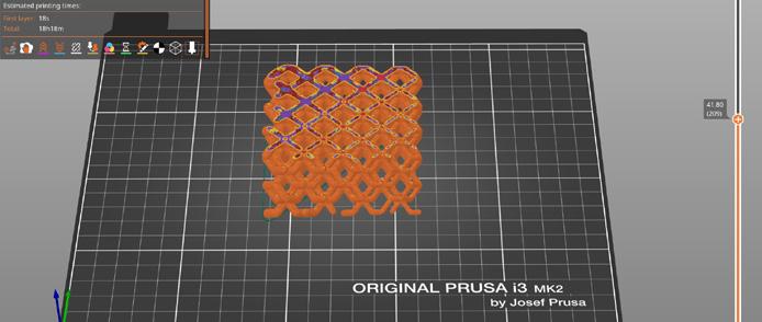 After creating the vase we moved to printing with infill. I designed a wall by manipulating a rectangle to give me the organic shape you can see in the figure above. I then lofted the shape and capped it to create a solid form ready to be exported. In figure 3 to the right you can see the sliced form from Prusa. I decied to print with 10% infill to reduce the print time while still retaing integrity.