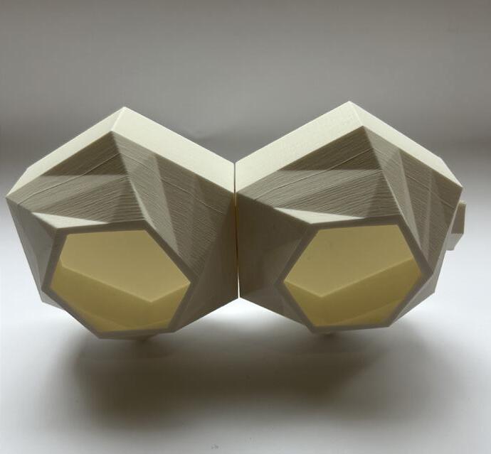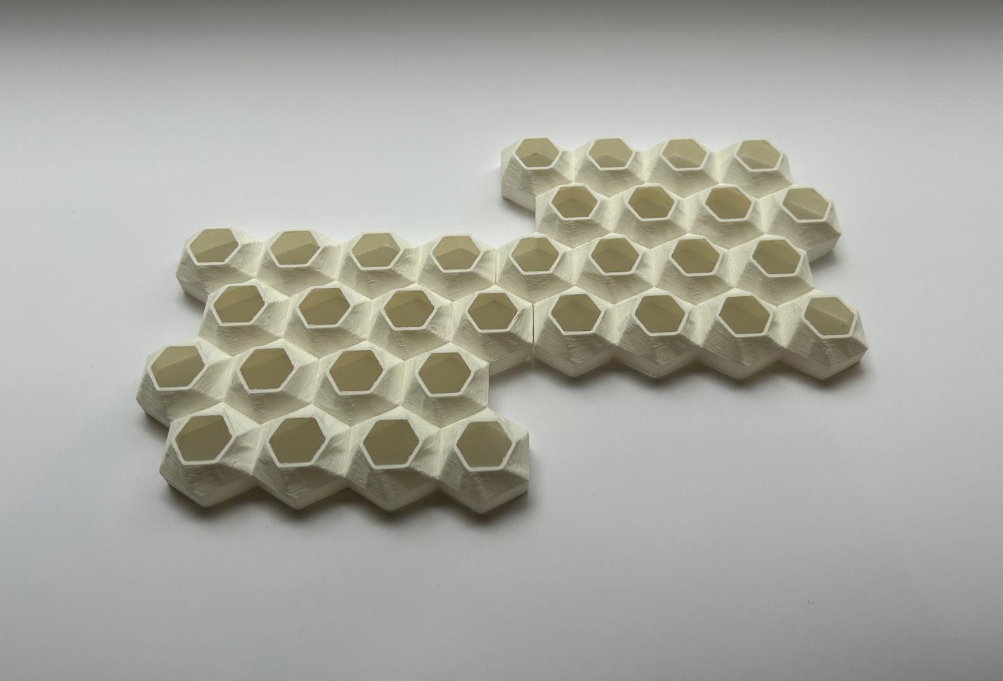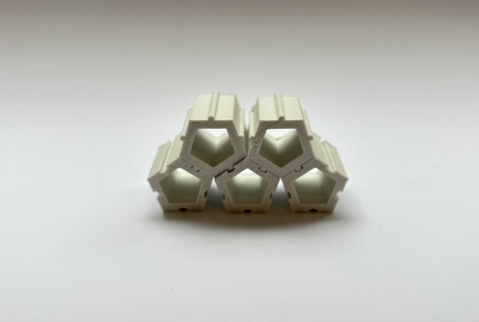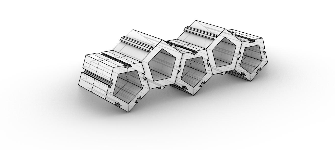 Trying to imporve upon my last design I moved away from the pentagon and chose to use a hexagon instead. This shape lends it self to be aggregated much cleaner. There are no gaps and the symmetrical design means there orientation is not as important as in my previous iteration. Along with this I improved the desing by making the front face more intresting