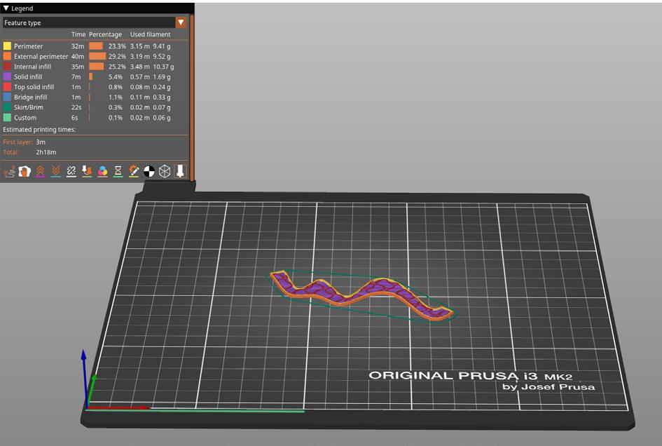 that connect to the shell is very import. we can see this anchors stringing across the exterior of the spear, however these anchors are not essential for this print thus removing them cleaned the slice model. The second issue was print bed adhesion. Given the delicate nature of this shape I ran into issues removing it from the print bed. I ended up breaking the model in