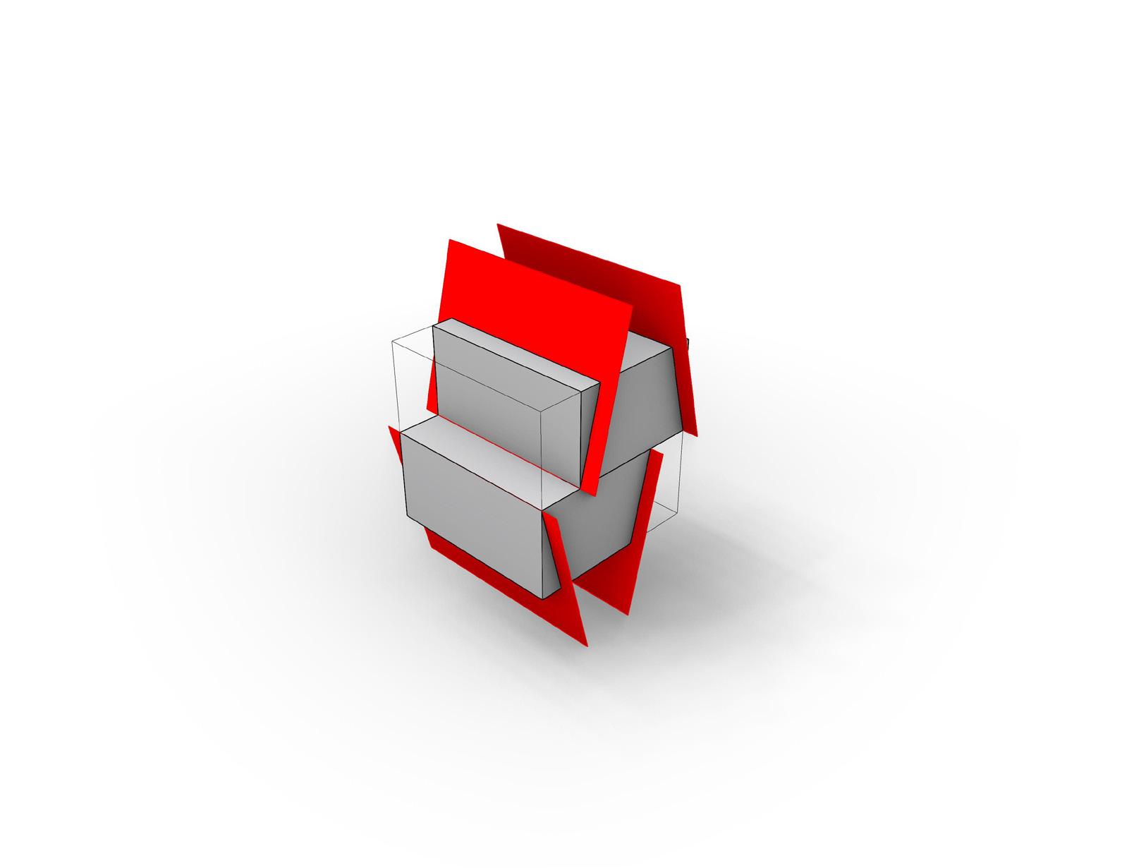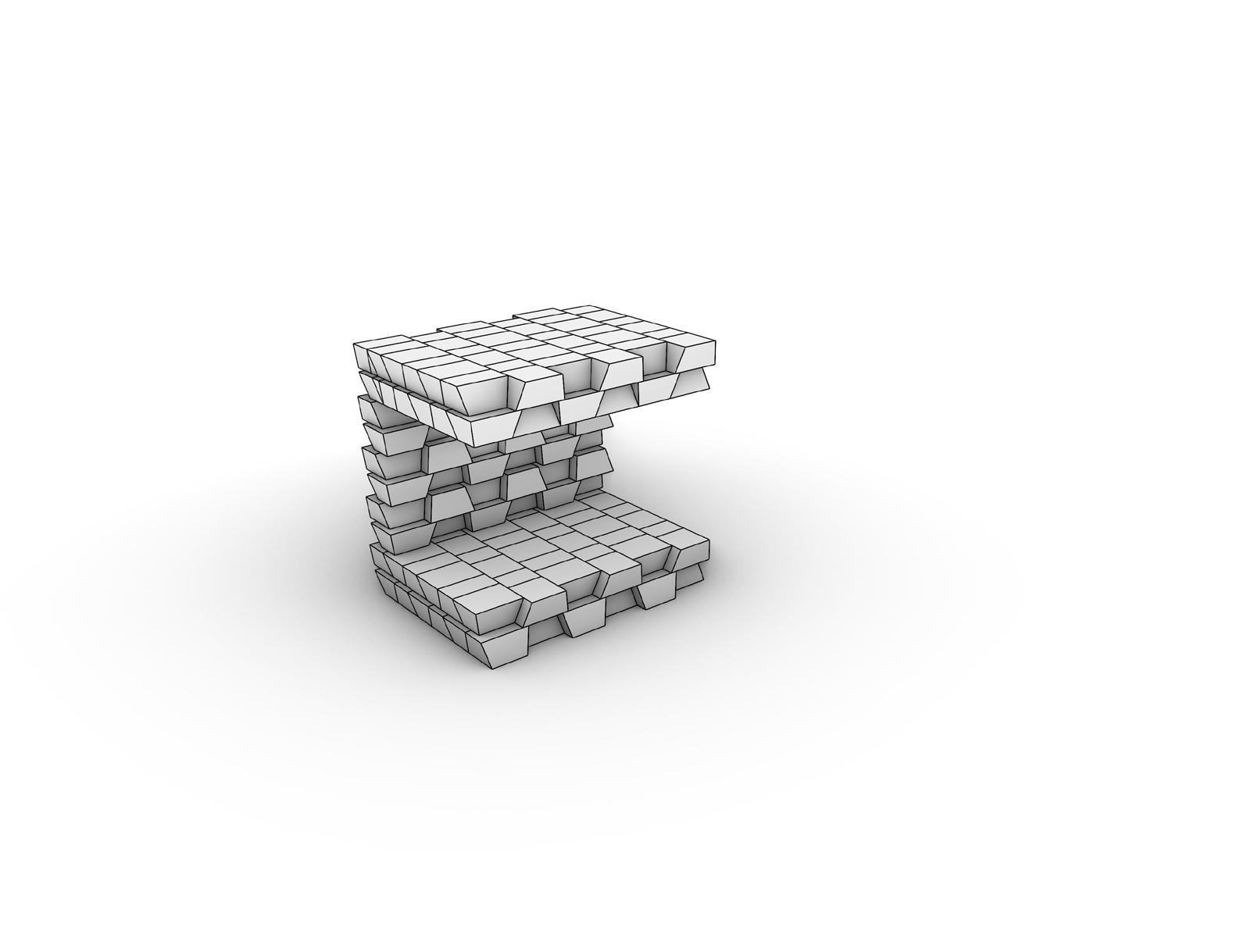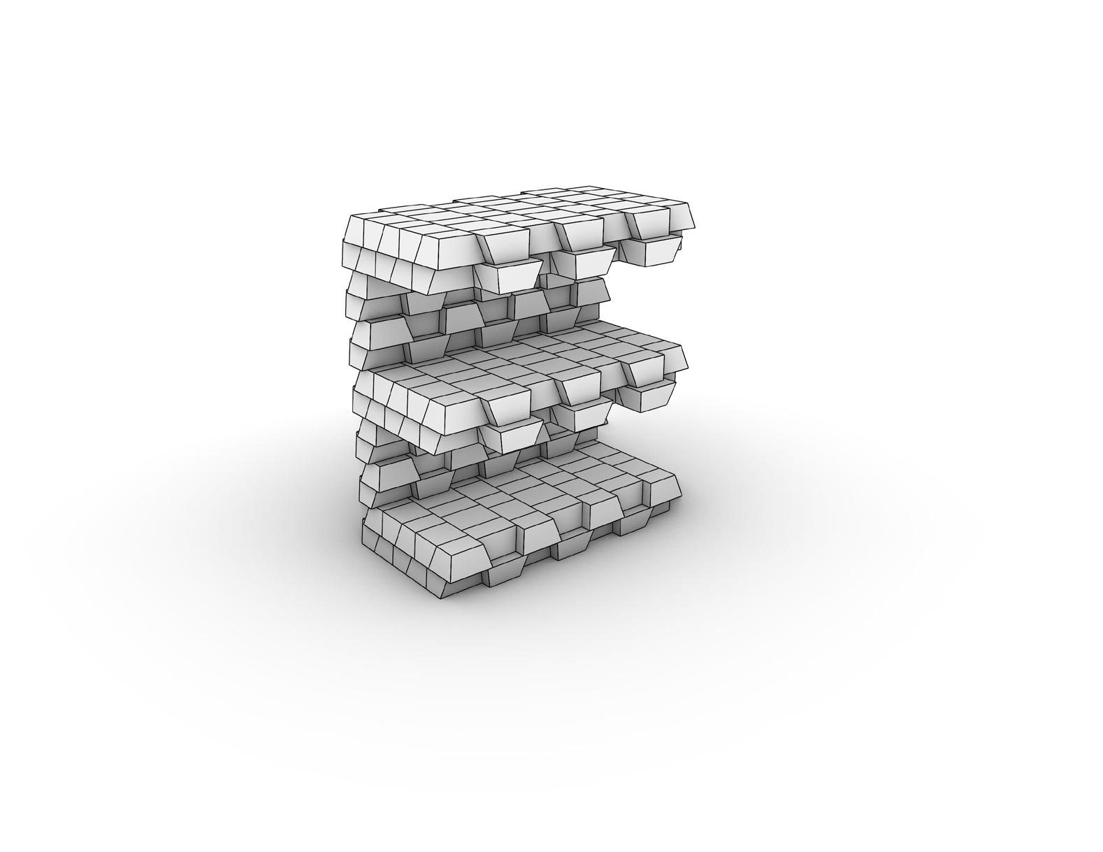 unit allowed for a textural effect that appears similar to 3-dimensional wallpaper. The connections from wall to wall and floor to ceiling were achieved with a face to face aggregation of the component. As the basics were achieved, the aggregations proceeded to test more complex studies, such as assessing its capacity to generate multiple floors.