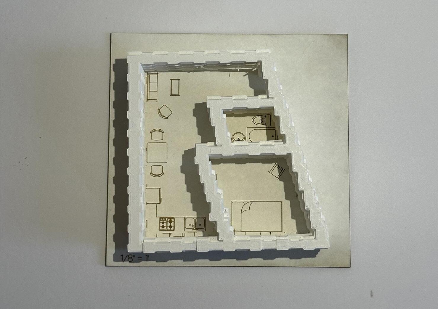 Working with various scales of the unit allowed for exploration within the spacemaking of the housing units. Originally working with a component cut from a 1’x1’x1’ cube, the scale was intriguing, but fell in a middle ground area where openings were slightly off of the human scale, but not enough to appear intentional.