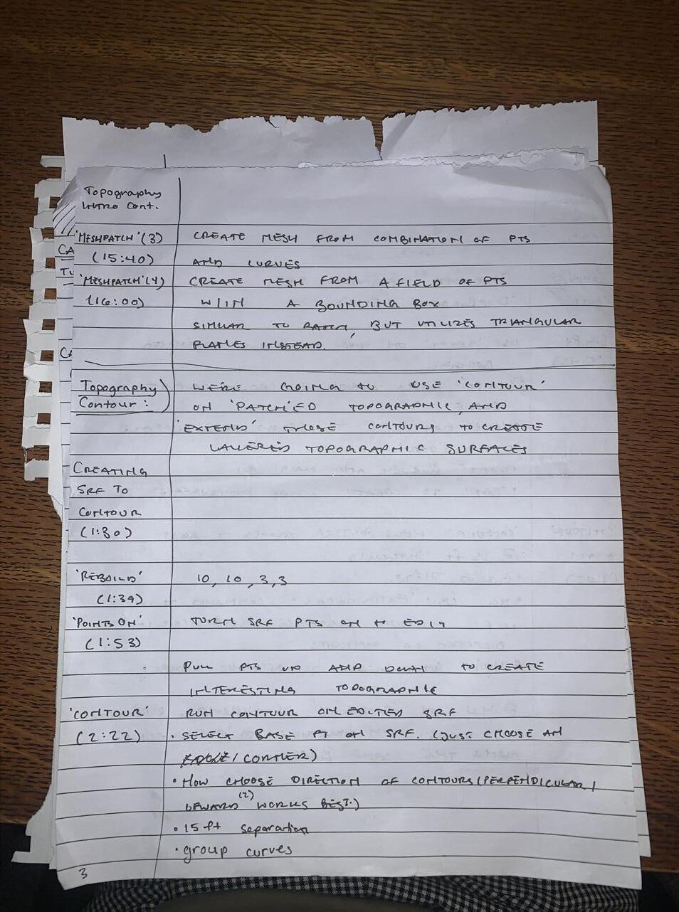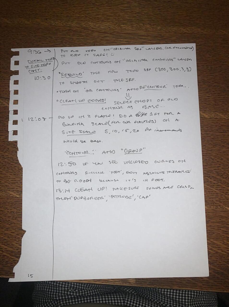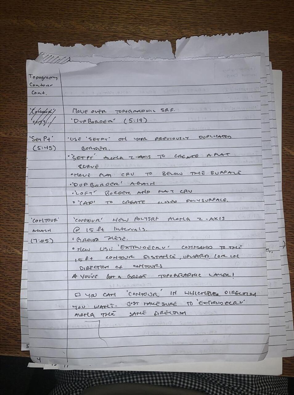 The handwritten notes were especially helpful for me. I chose to take notes on the topography week, which was one of the more lengthy and complicated weeks. It helped me solidify the workflows and clickstreams for basic topographies. The Set Pt command proved to be very helpful.