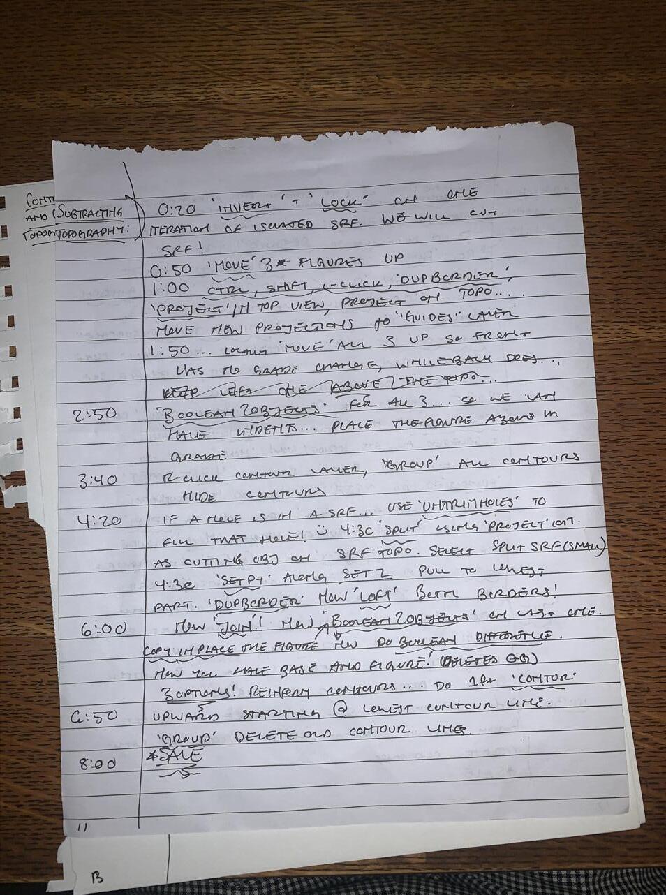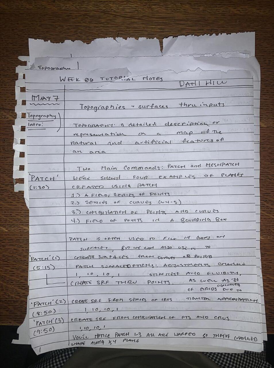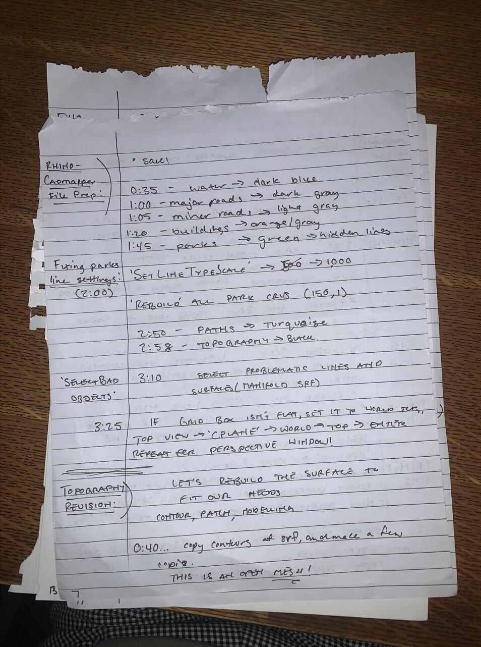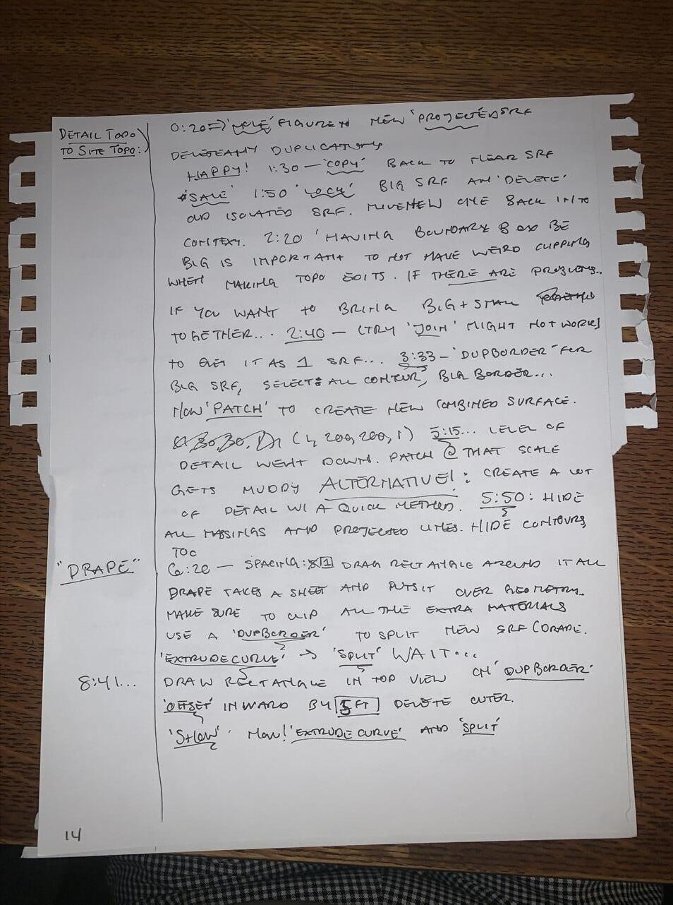 The handwritten notes were especially helpful for me. I chose to take notes on the topography week, which was one of the more lengthy and complicated weeks. It helped me solidify the workflows and clickstreams for basic topographies. The Set Pt command proved to be very helpful.