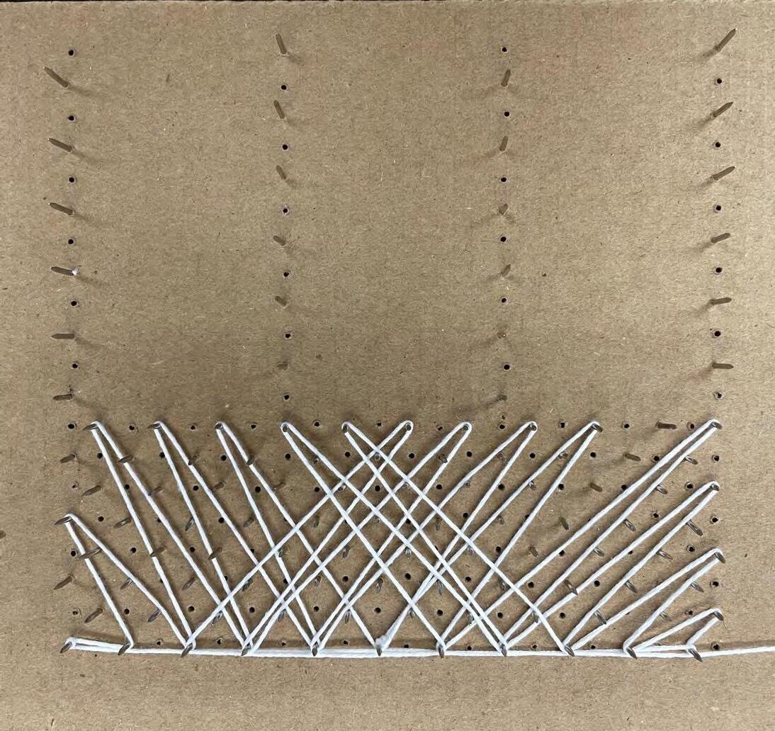 also an experiment in scale of voids and density of lines. This pattern contains rows of points that align at the top, emulating the geometry and construction of a spiderweb. The overlapping lower points in this pattern simulate the appearance of droplets of water.