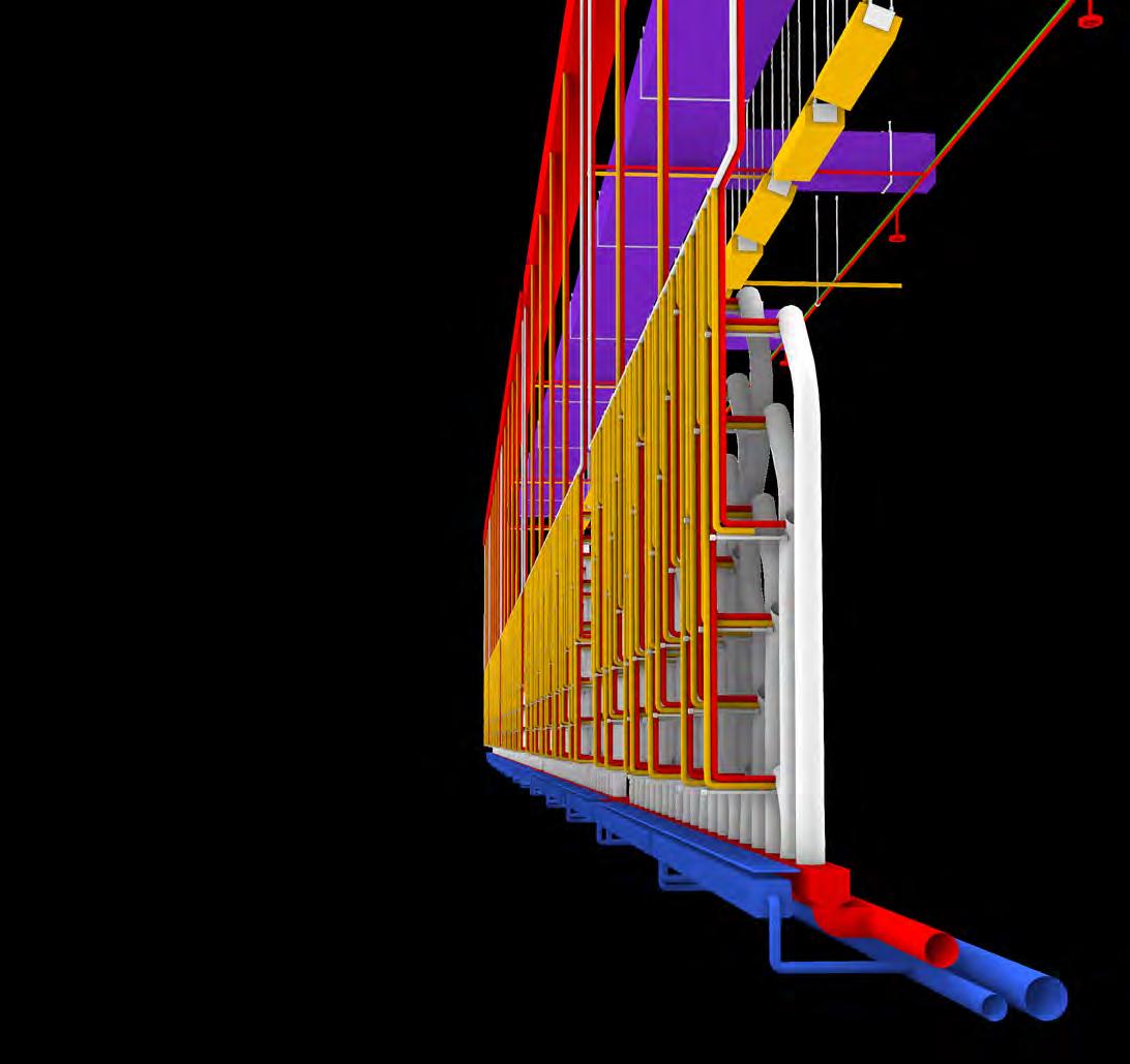 Electrical and water lines are run along the wall. A gap is left for the radiant-steamplane. The pipes of the installation and its plants are located furthest from the wall plane and closest to occupants of the space. A drainage system is located under plane. All of these elements are carefully placed within the gap between columns,
