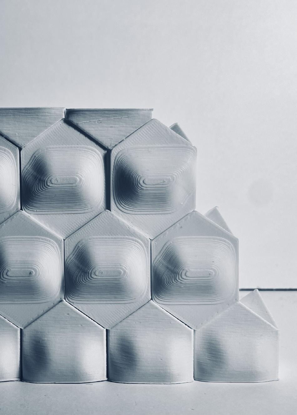 the structure. The increased depth not only strengthened the physical connection but also added a sense of dimension and complexity to the structure. Additionally, the flat hexagonal face was transformed into a subtly curved surface, introducing a dynamic, wavy effect that propagates throughout the assembly when the modules are connected.