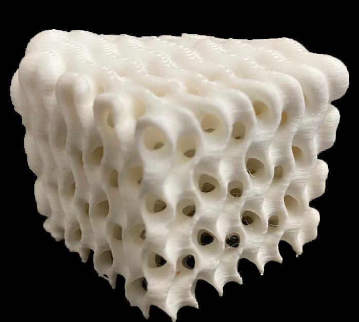 This design was created using a Grasshopper definition. It used the plugins, “Crystallon,” “Pufferfish,” and “Dendro.” Grasshopper was used to create a series of voxels that varied in size based off of a gradient between two points. This resulted in the corners of the geometry being puffier and thicker than the other corners. It was a complex geometry that took four hours to print.