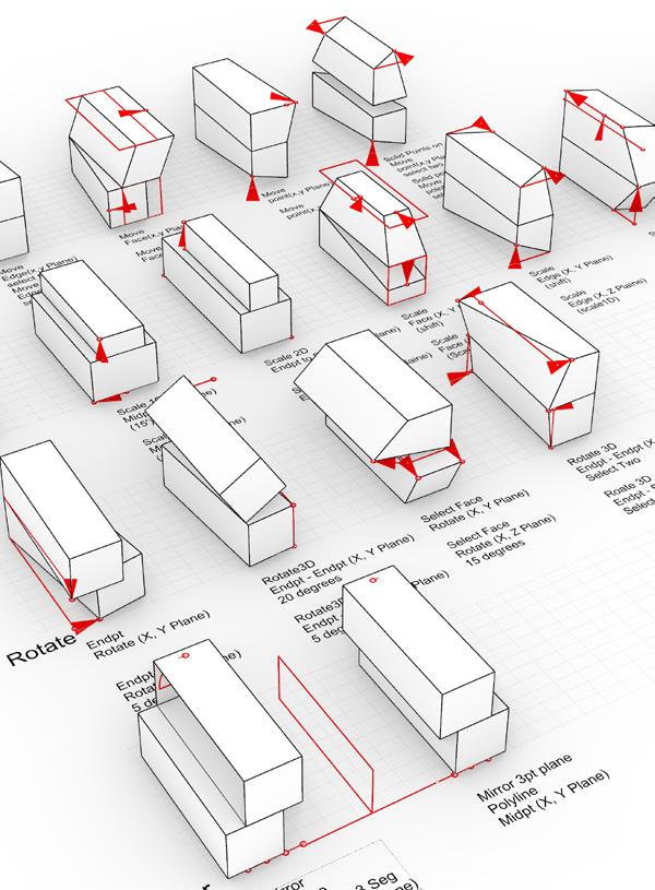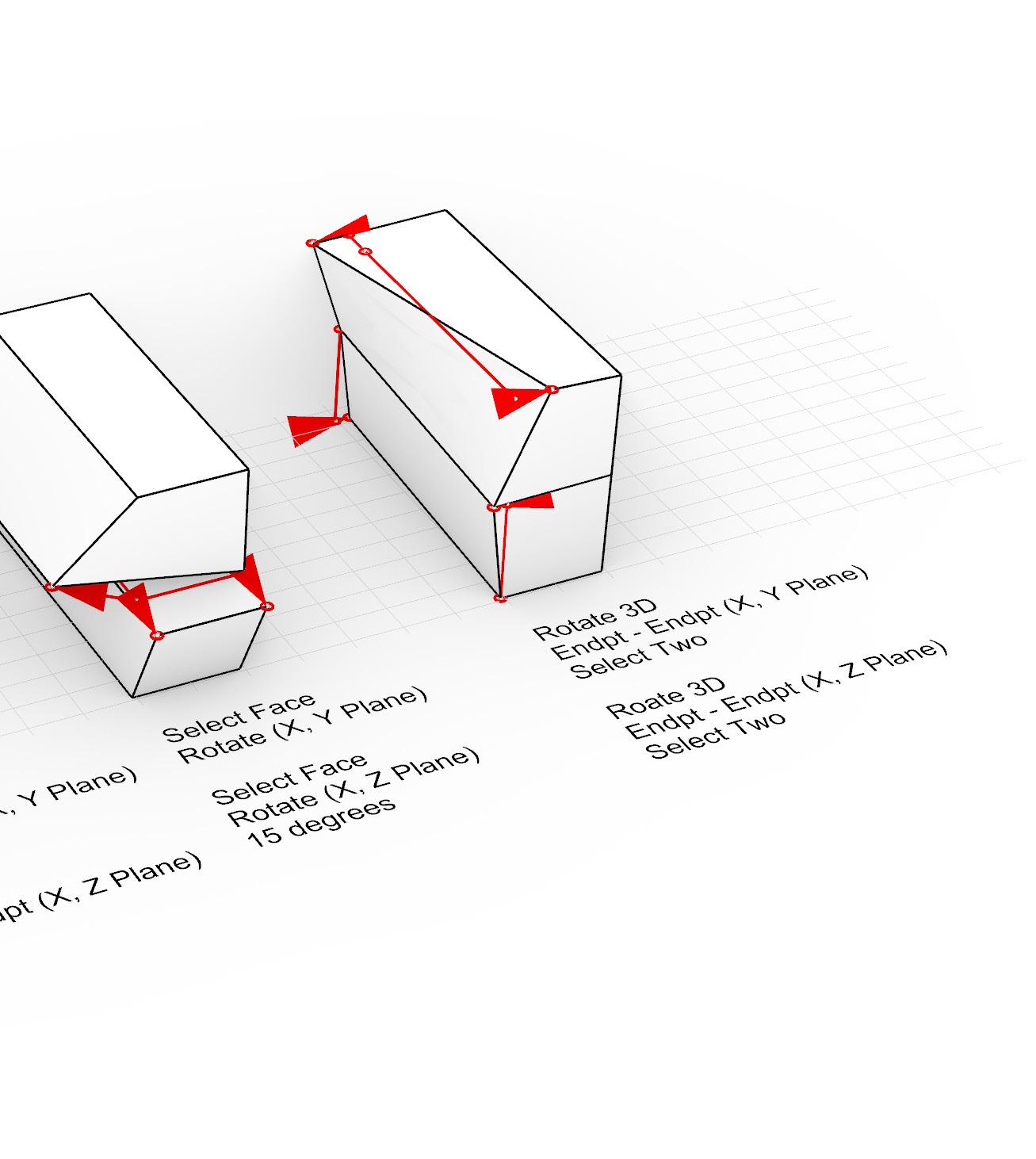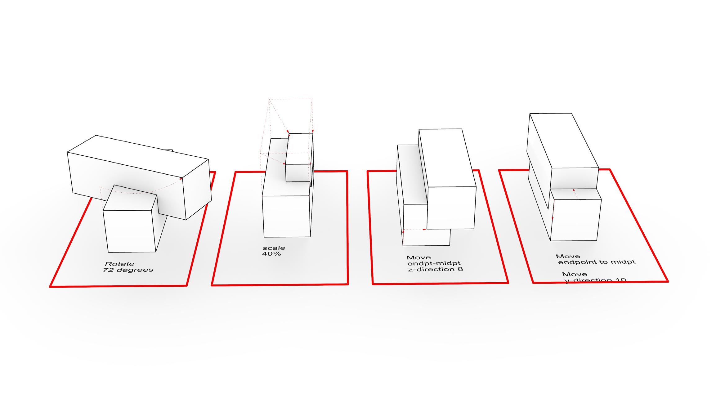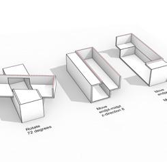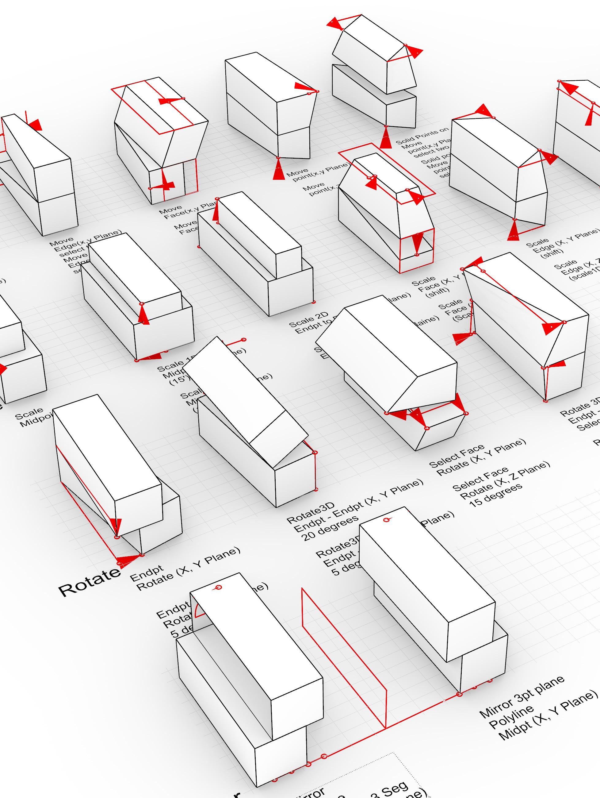 This module is an intro into manipulating objects in the X, Y Plane and the X, Z Plane in Rhino. Using a few simple comands; Move, Rotate, Scale, and Mirror, we were able to manipulate two simple rectangles into architectural shapes. Drawing movement lines of the destortion makes it clear how the movement effects each shape.