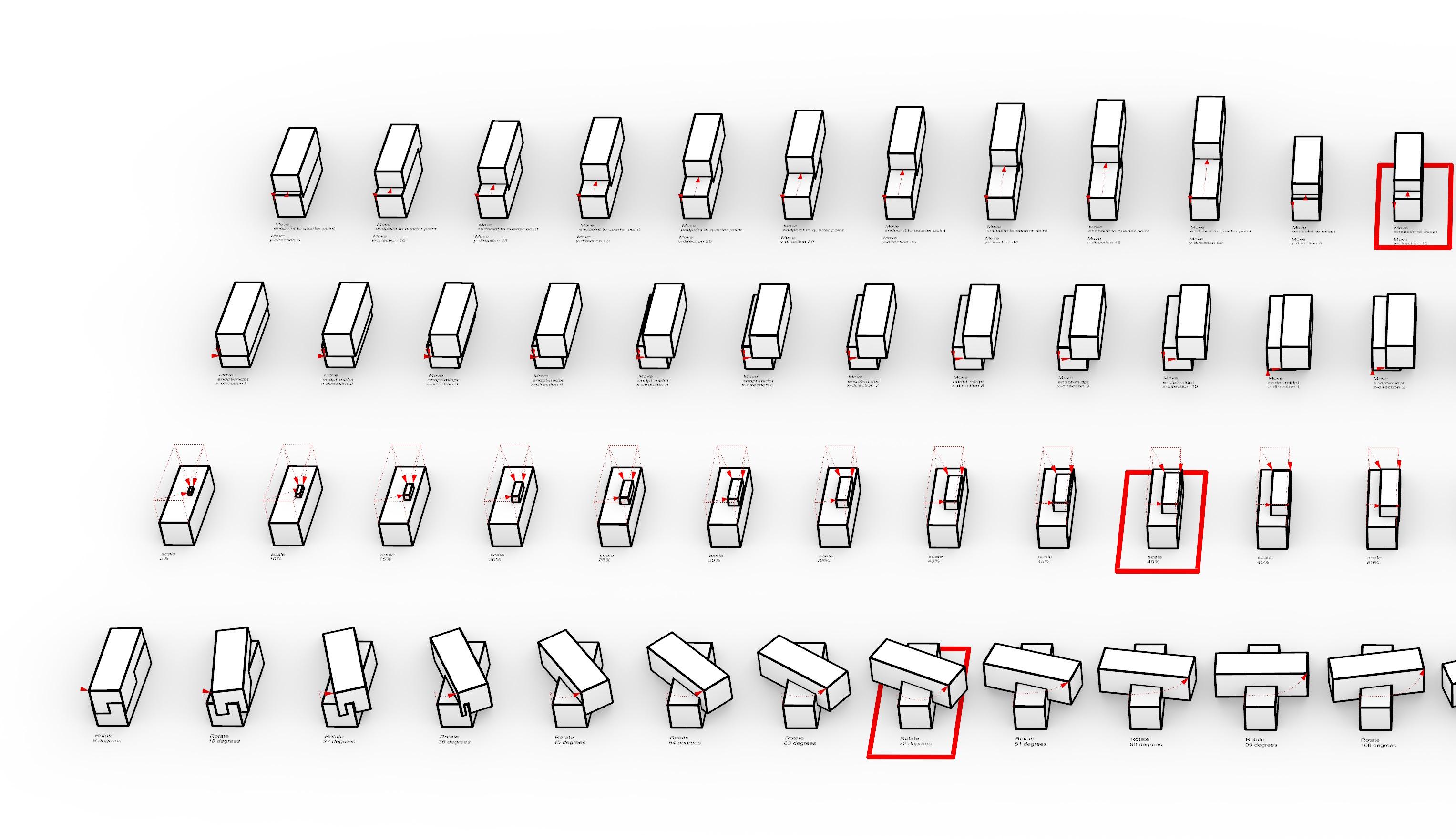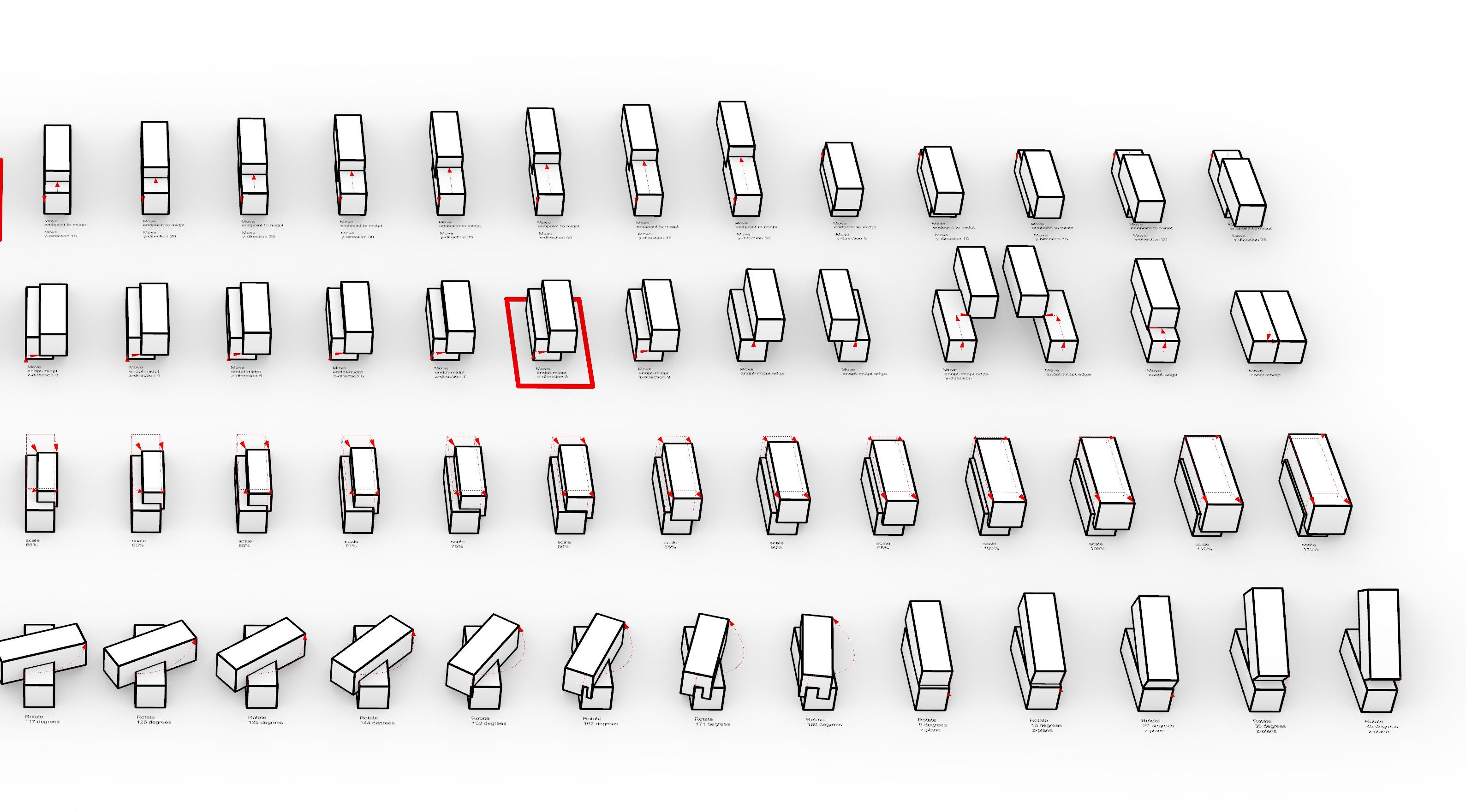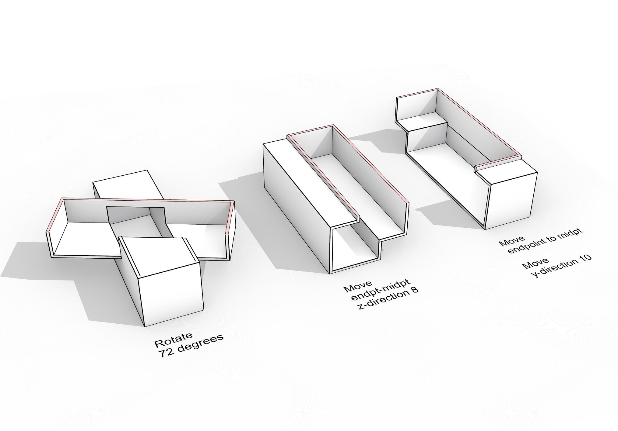 This assignmennt used 25 different iterations of four simple commands to learn how patterns can look with slight difference. My chosen commands are Move(Y plane), Move (X plane), Scale, and Rotate. Adusting the top block by a set interval alows for a set of repeating patterns.