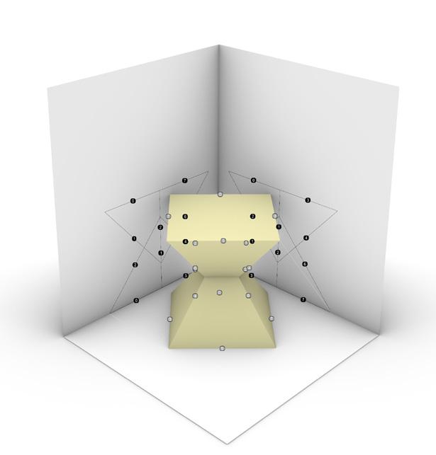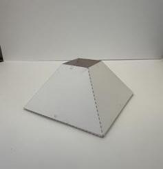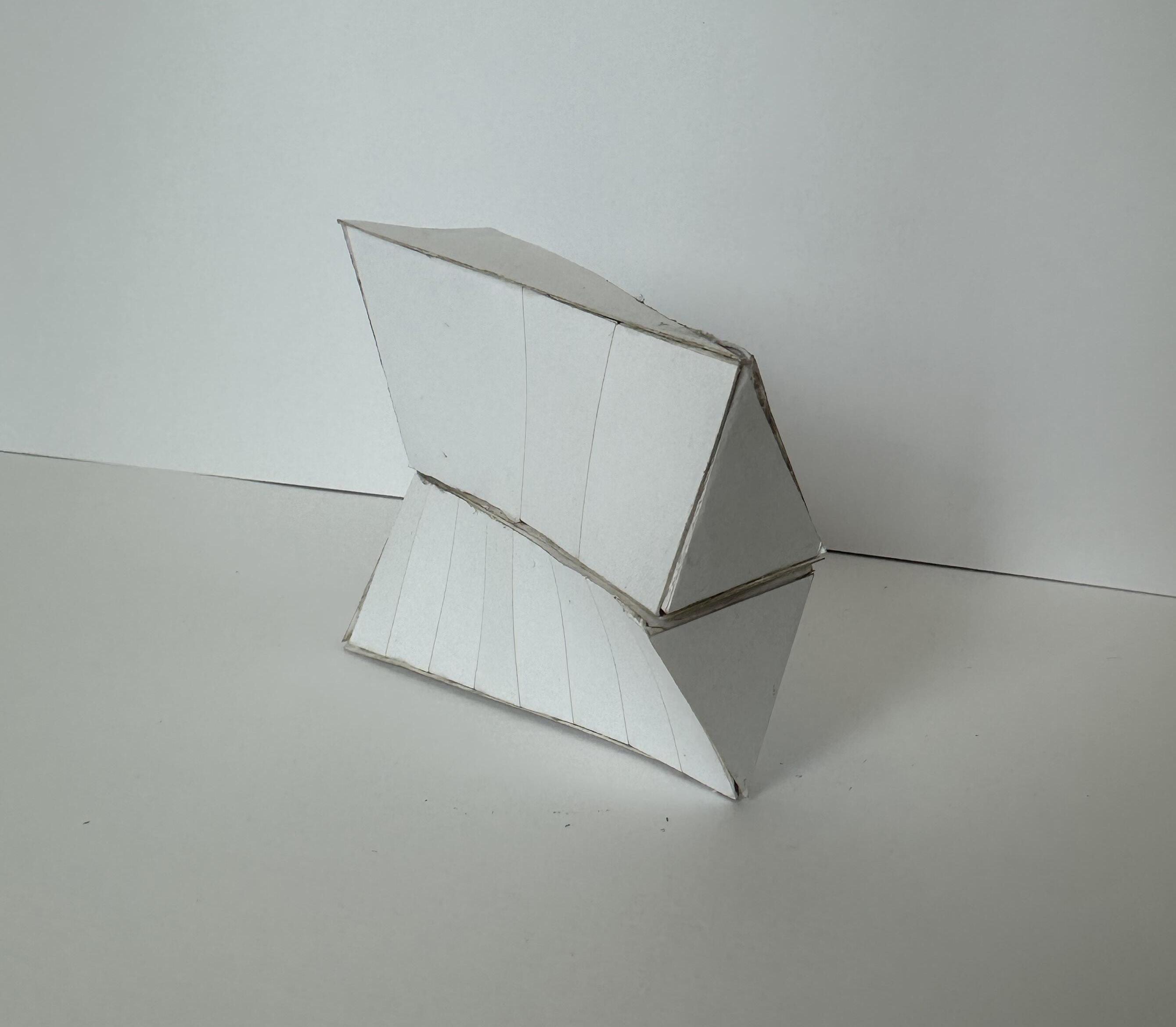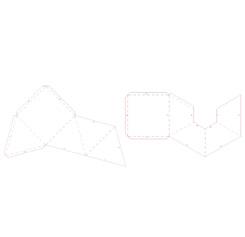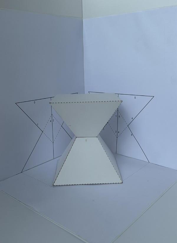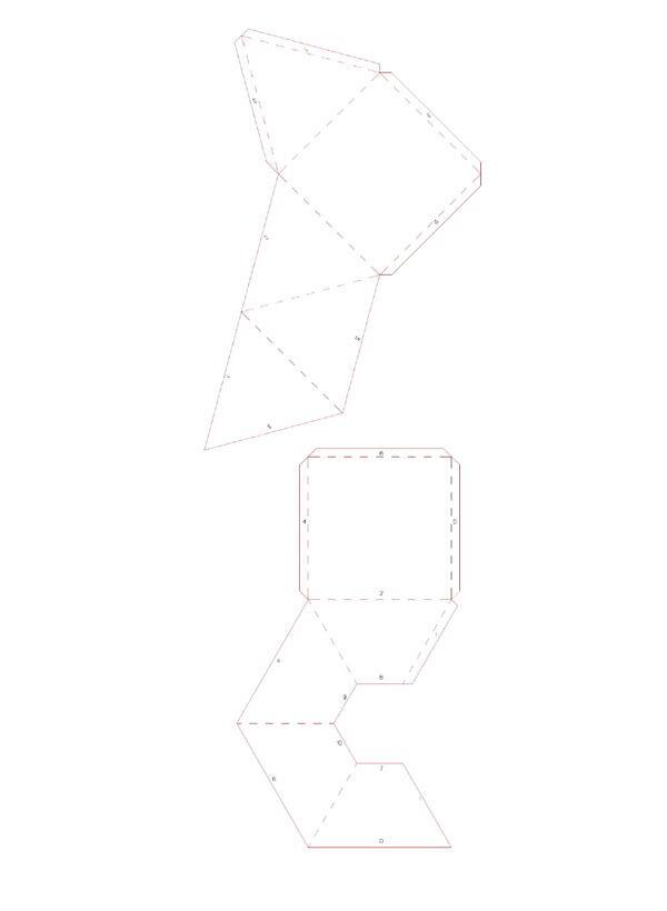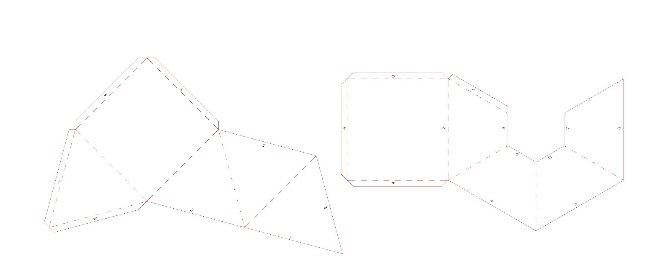 Starting with a basic pyramid, rottating one, and imbedding it within the other. This became the main structire of the two primitives (shown to the left). I then cut out a notch on the bottom pyrmid (shown bottom left) where the top pyrimid could slide in (shown bottom right). Unfolding these shaes and making them 2D allowed me to have the template (shown to the left) for each of the primidives.