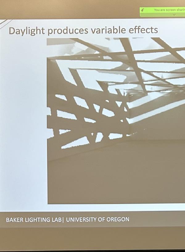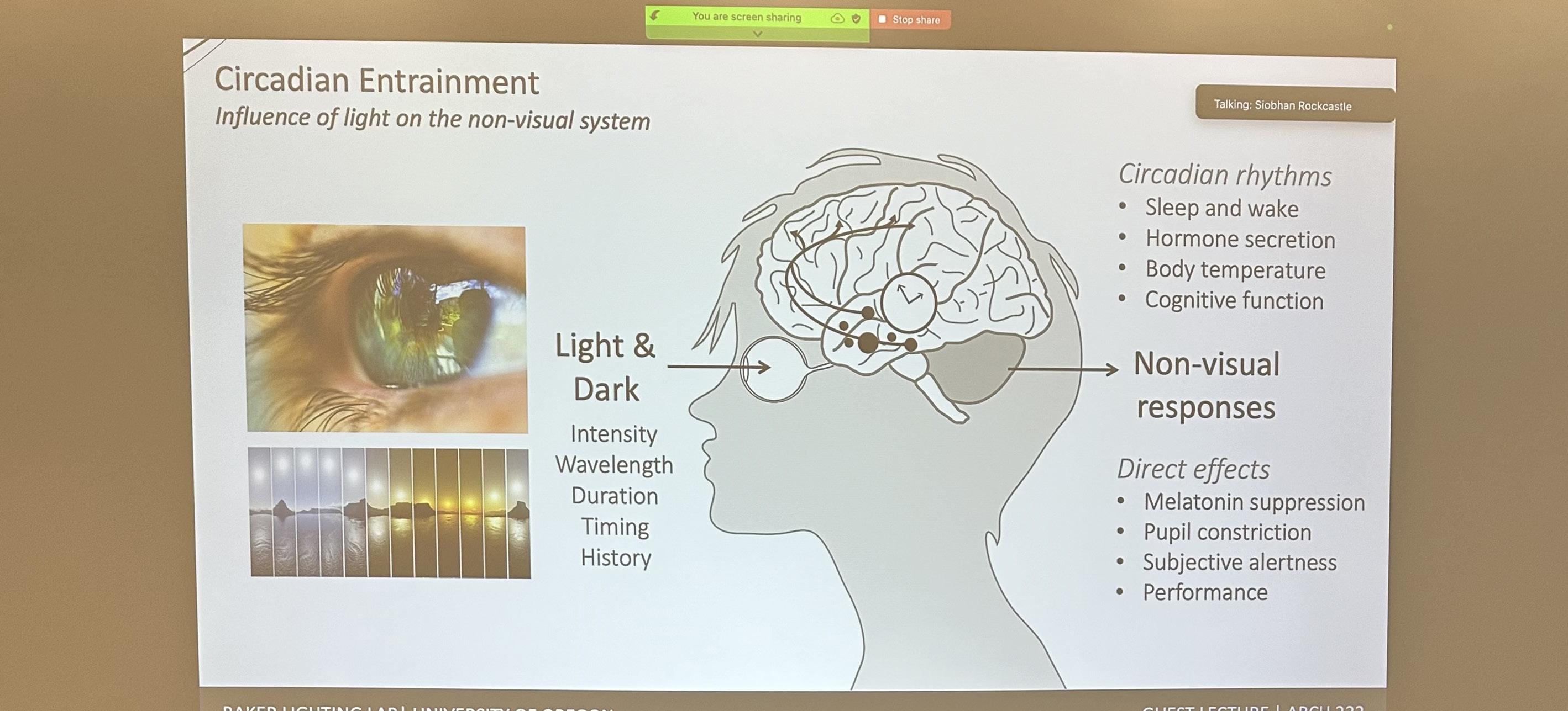 She also talked about a very important thing about light, that I didn’t know, the non-visual response of light. This has to do with how a building affects our circadian rhythm due to a building blocking light waves. Keeping this in