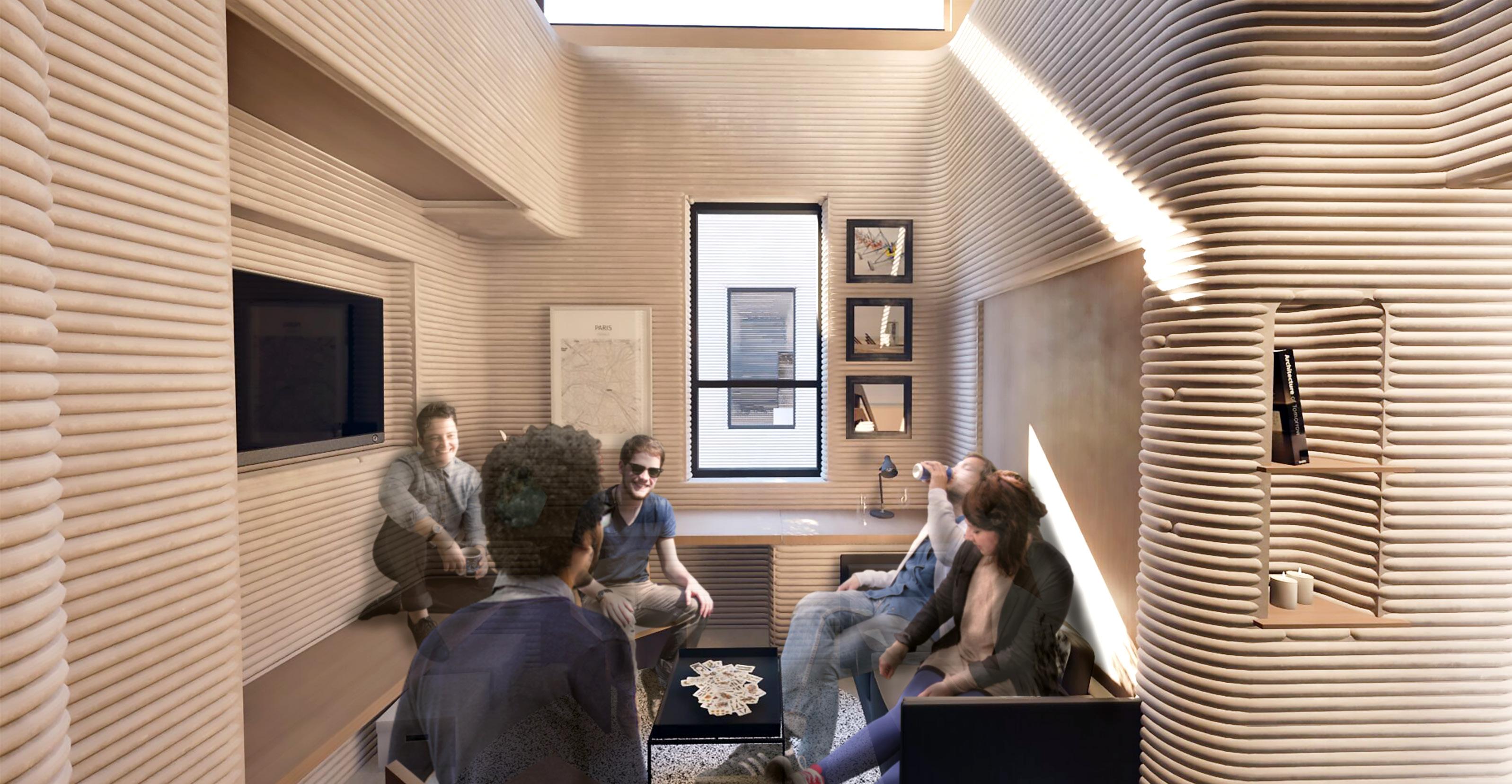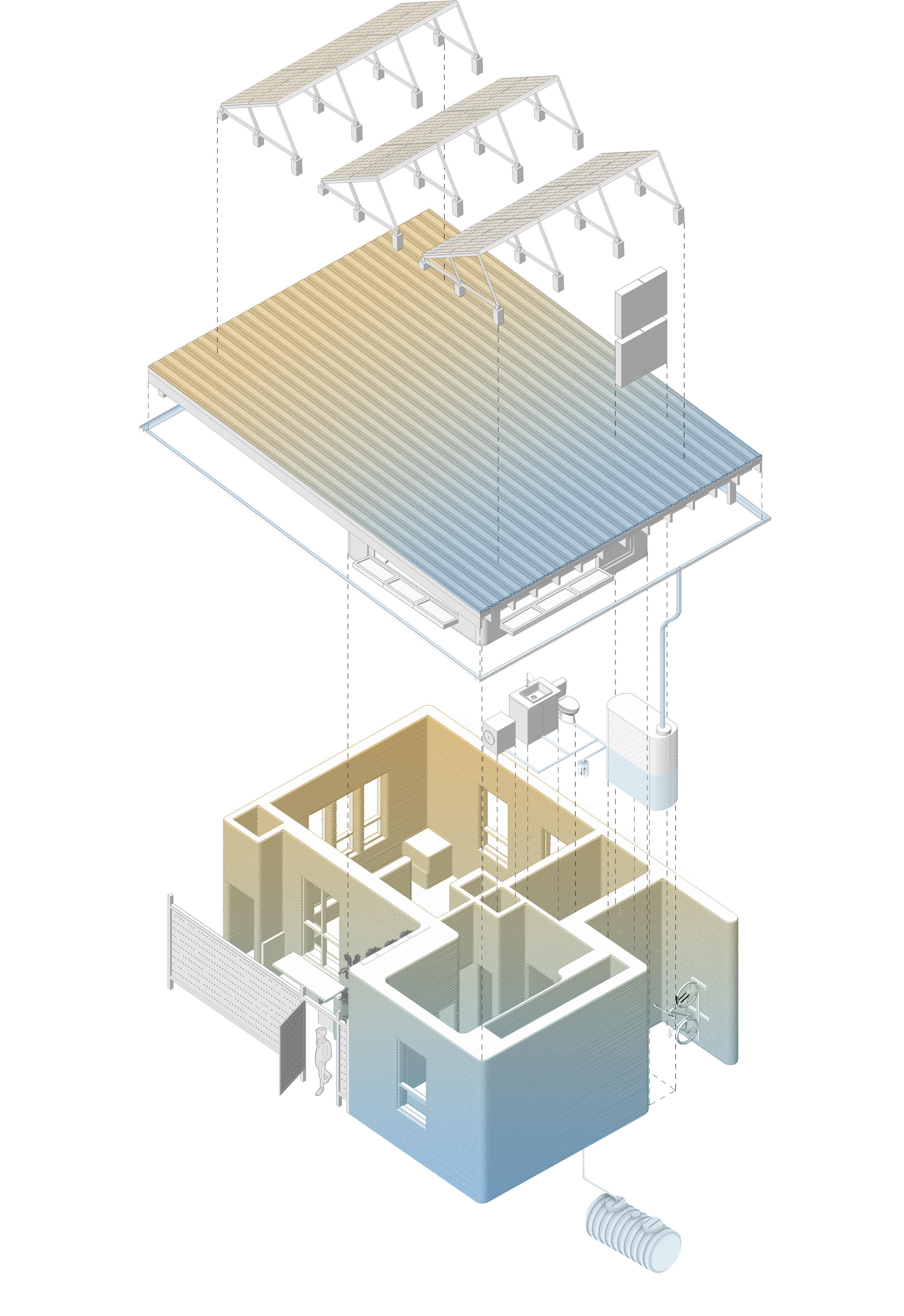The use of 3D-printed structural walls in combination with Kingspan LEC roof panels makes construction efficient and cost-effective. Rainwater collection and storage are made possible by a Kingspan Slimline water tank used for irrigating the project’s green wall, flushing toilets, and running sinks. Solar panels and a battery system operate the electrical components. These systems allow NOMADAPT to survive off-grid and enable its construction universally.
