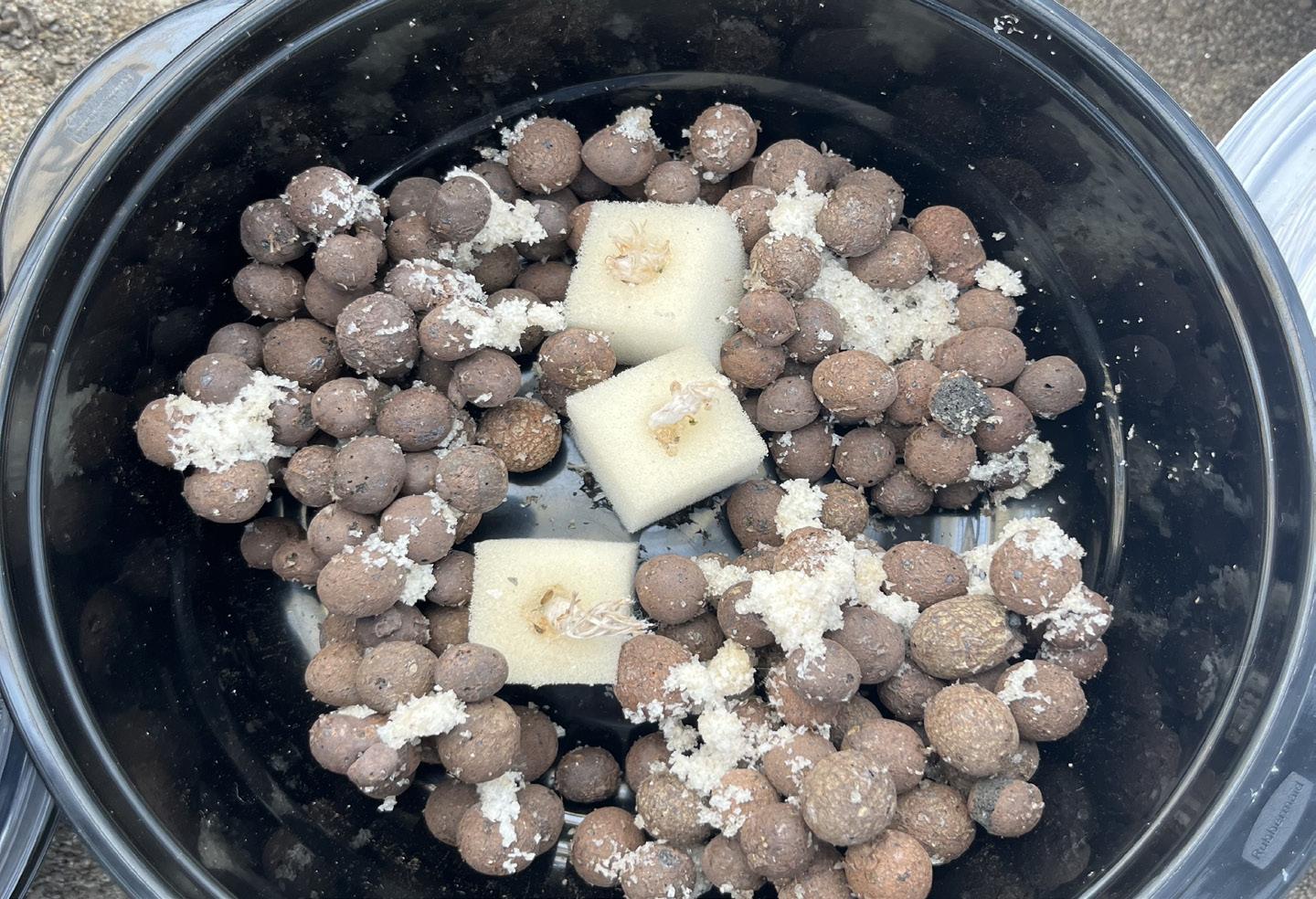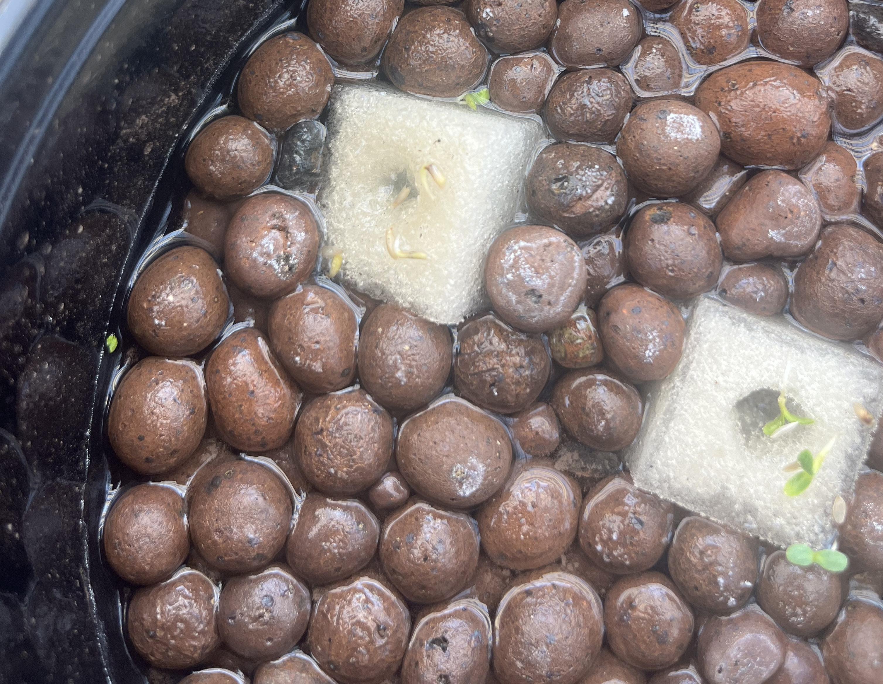 As part of my initial test, I sought to test the capabilities and capilary action of hydrogels by creating a vertical system that worked in solid layers. From left to right as depicted above, I would test hydrogels, expanded clay balls (ECB), and hydrogels in combination with ECB. A layer of grow sponge would be placed atop each selected medium and germinated seeds would fill each aperature of the grow sponge in a