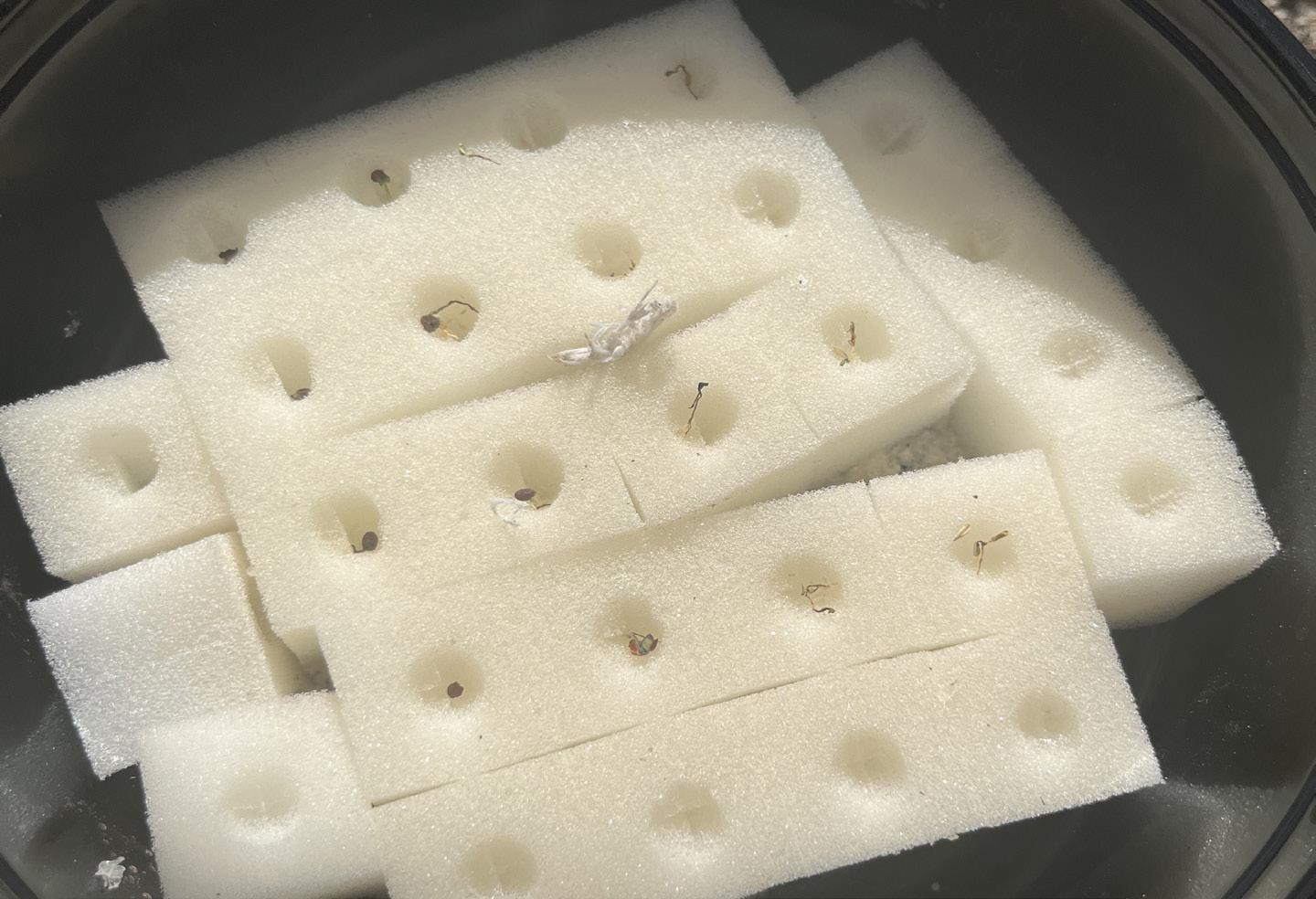 6.) Place germinated lettuce seed into grow sponge apperatures.