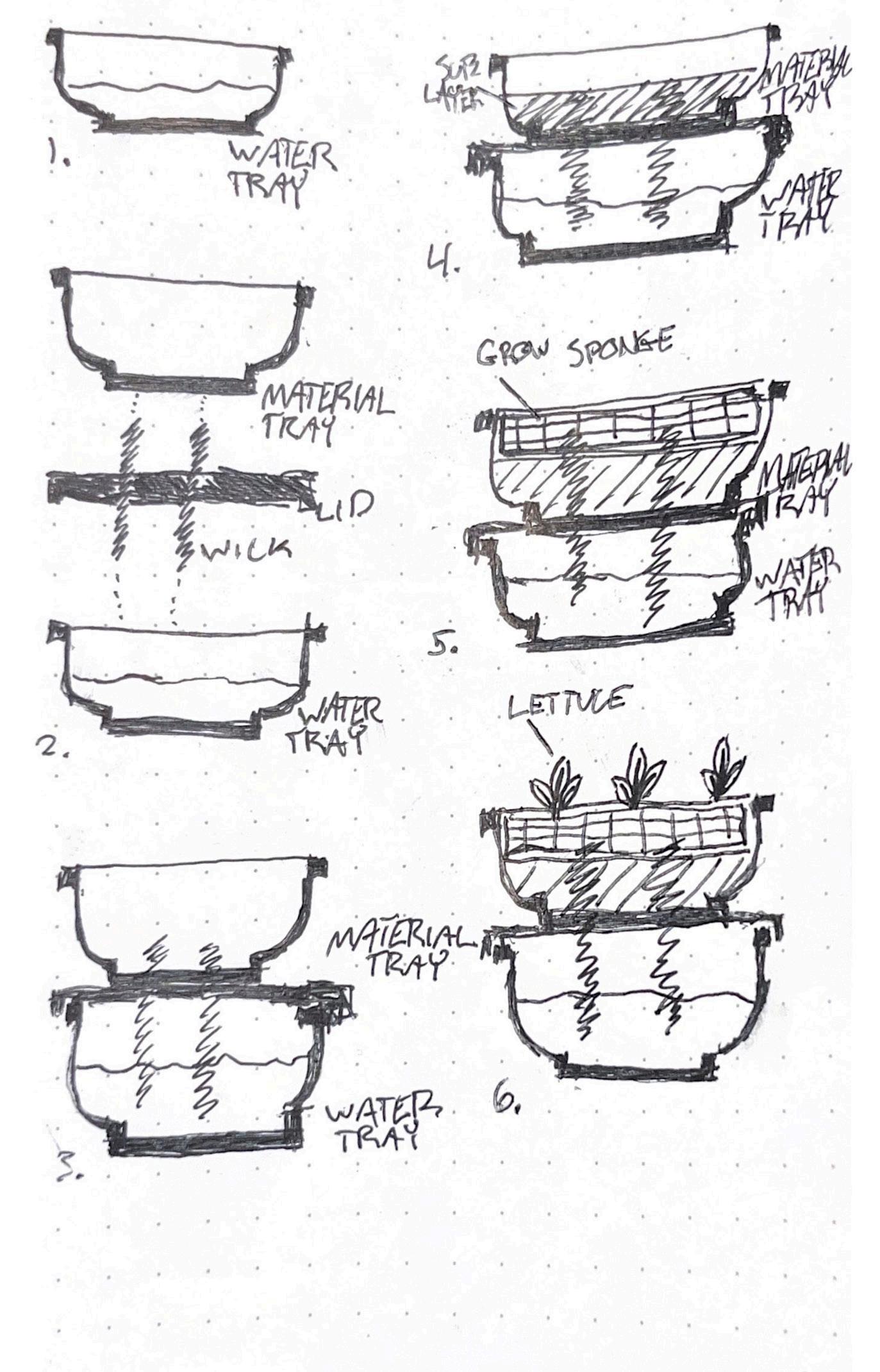 Pictured above are the initial sketches regarding how I planned to produce a hydro-draw system. My plan to test a variety of medium buildups in the first phase remained consistent throughout this projects development. But originally, I had intended the second phase of testing to focus more on wick placement within a compartamentalized structure. Although the wick DESIGNING THE HYDRO-DRAW SYSTEM
