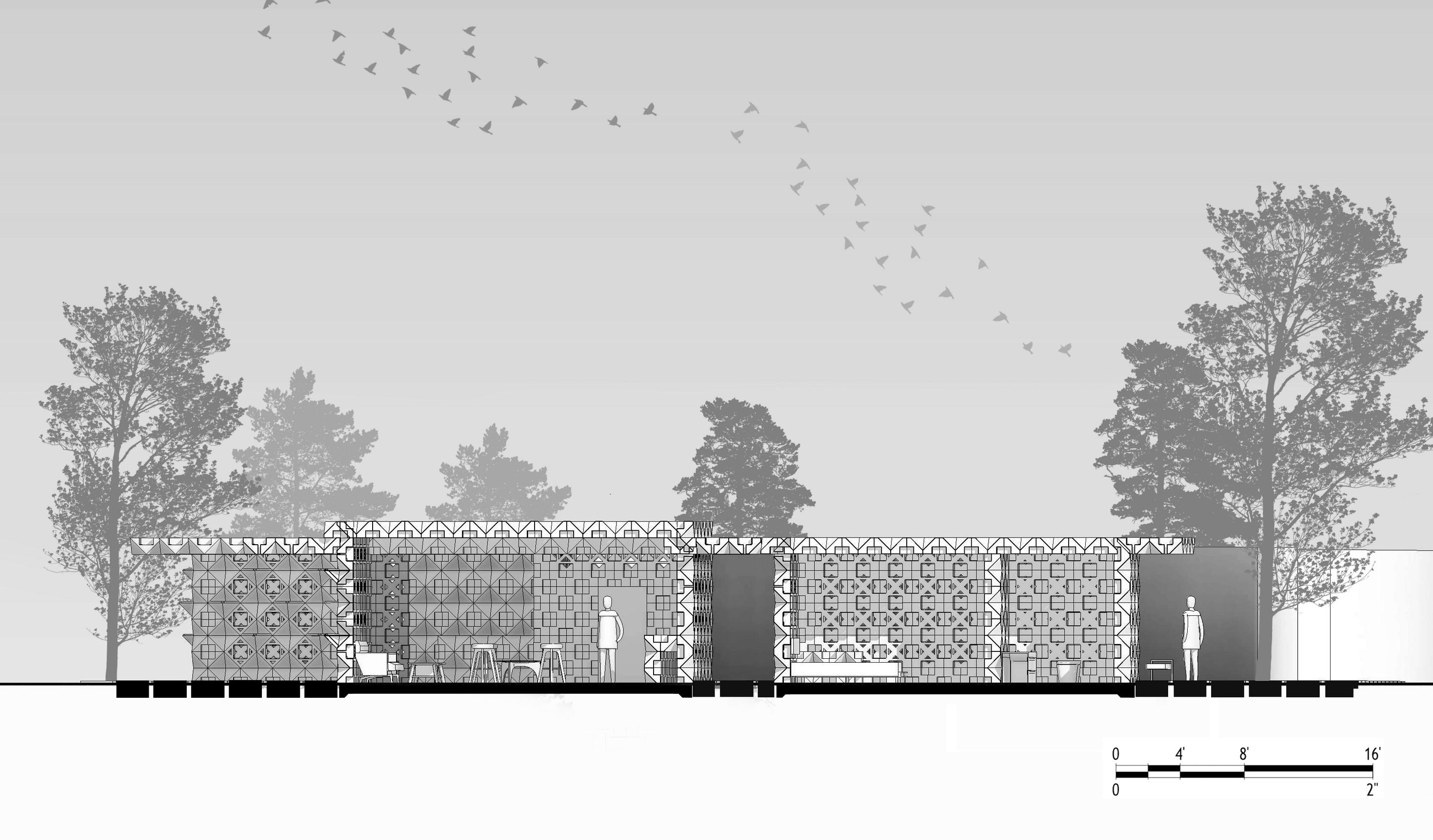 The use of porosity within my units was a way to create a one of a kind lighting exsperience within the house while at the same time provide a beautiful facade on the exterior. The opening serve not only to bring in light to the more public areas of the house but also to breakup the exterior facade. They make the siding on everywall unique and differnt drawing vistors eyes as it catchs the light on each units various edges and formes amazing shadows across its facade.