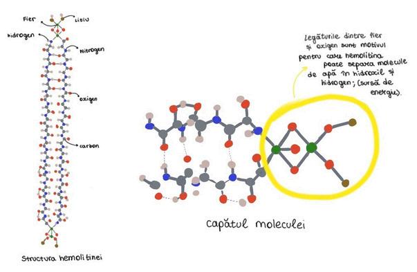 Structura hemolitinei este unică: legăturile dintre lanțurile polimetrice de glicină s-au combinat cu atomii de fier și oxigen ce rezidă la capătul moleculei.