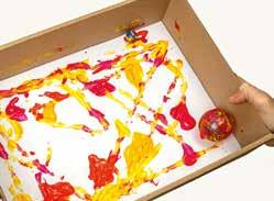 Placez une feuille de papier blanche dans une boîte. Répartissez quelques gouttes de couleur sur le papier et ajoutez une ou plusieurs billes. Faites ensuite rouler les billes dans la boîte en faisant délicatement bouger celle-ci. De jolies bandes de peinture apparaîtront rapidement.