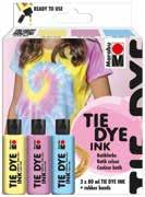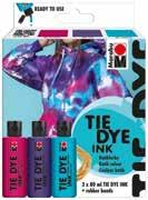 FR Bien humidifier les deux faces du textile à l‘aide d‘un vaporisateur d‘eau, le préparer selon la technique et le lier avec des anneaux en caoutchouc. Teinter le textile des deux côtés. Malaxer la couleur pour qu‘elle se répartisse bien dans le tissu. Retirer les anneaux en caoutchouc. Déplier le textile avec précaution et le faire sécher en le suspendant (suspendre le textile avec des pinces à linge).