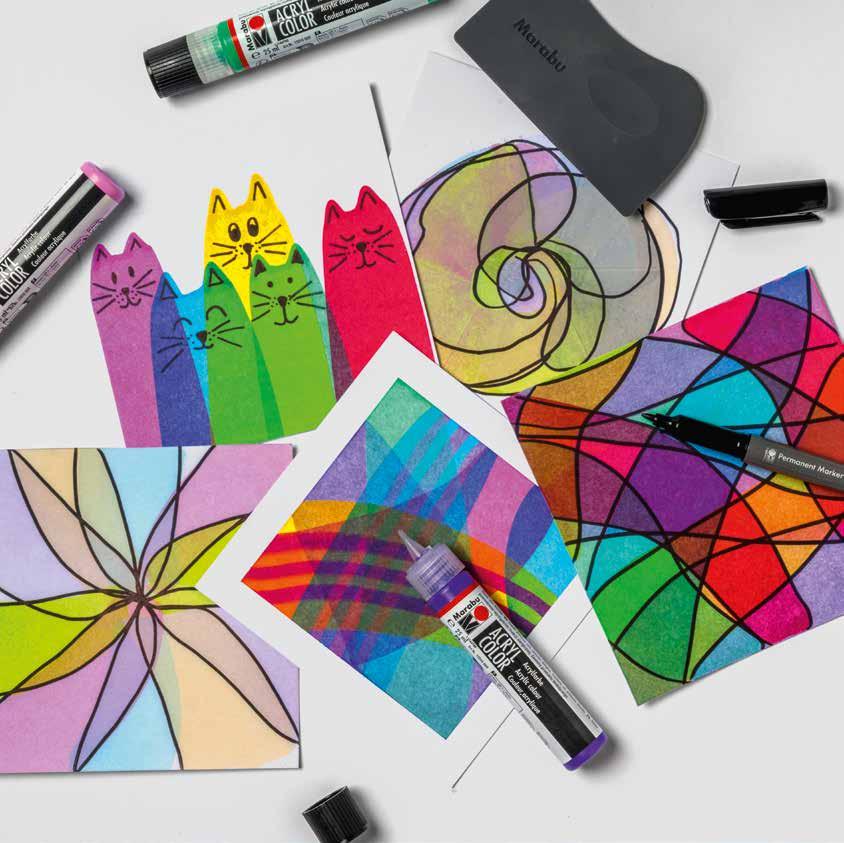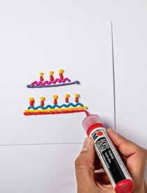 IT Motivi divertenti, come gatti, alberi o torte di compleanno, si ottengono posizionando in modo mirato punti e linee sulla carta. Dopo l‘asciugatura, la carta può essere ulteriormente decorata con un pennarello indelebile.