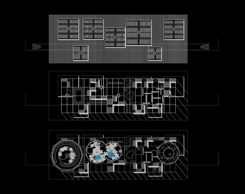 Respectively, the three levels are configurated, in a way that; from bottom to top, as seen on the drawings below, serve functions such as work, education and habitation.