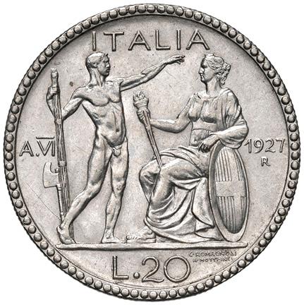 1195. venti lire 1927 a. vi mir. 1241 b ag gr. 15,03