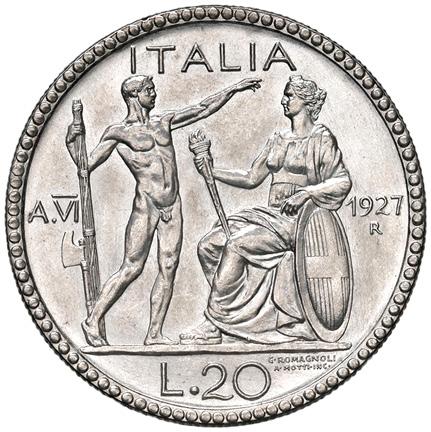 1196. venti lire 1927 a. vi mir.1241 b ag gr. 15,01