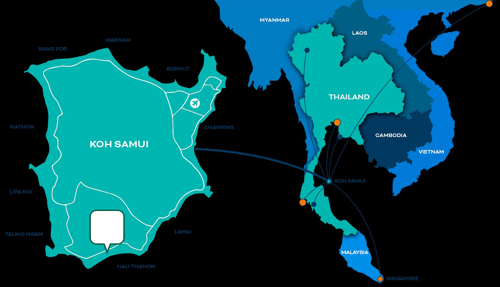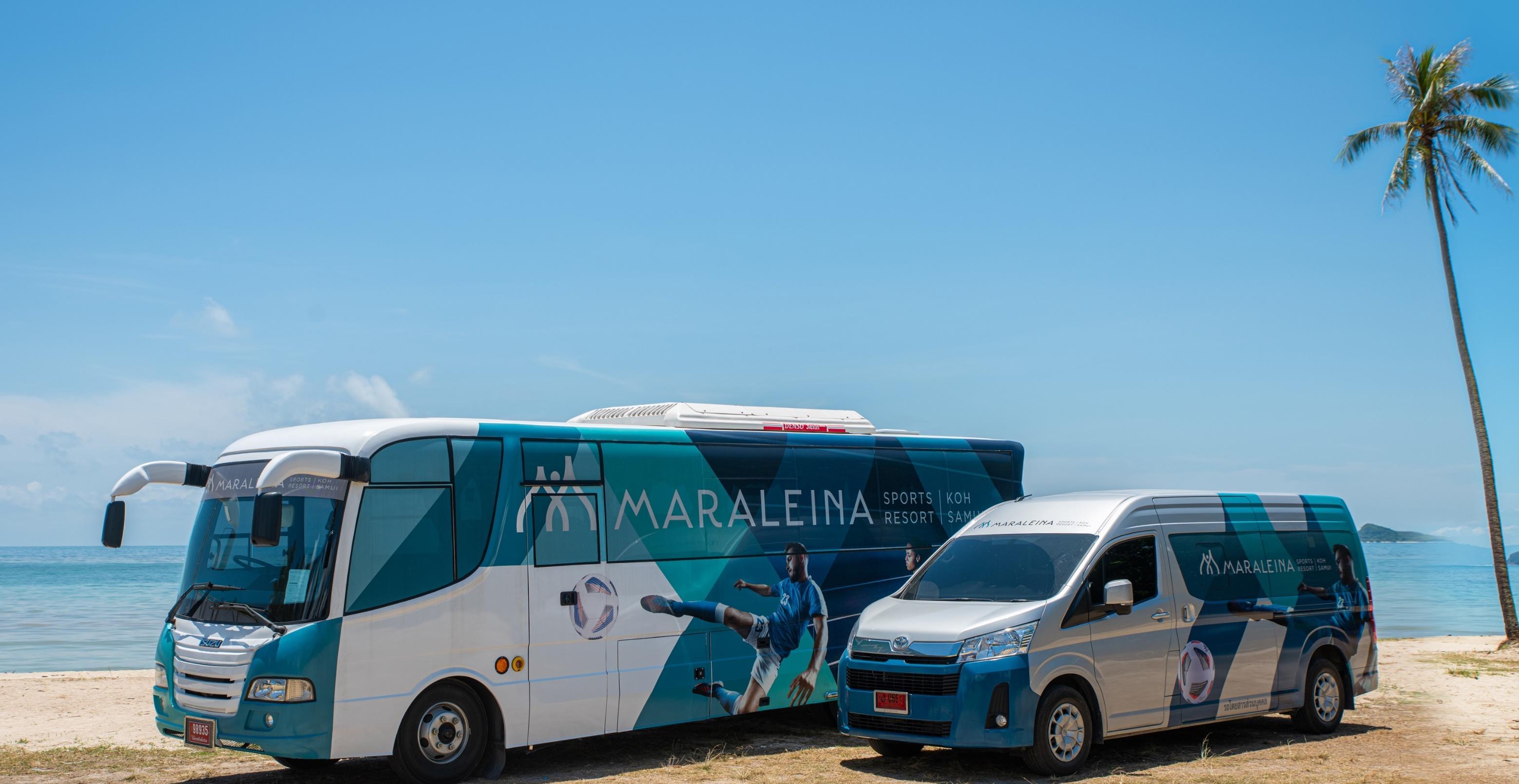 For the seasoned traveler, Koh Samui can also be reached via ferry from Surat Thani . Maraleina Sports Resort is located just 30 minutes from the Koh Samui Airport and 20 minutes from the ferry port . We offer complimentary shuttle service .