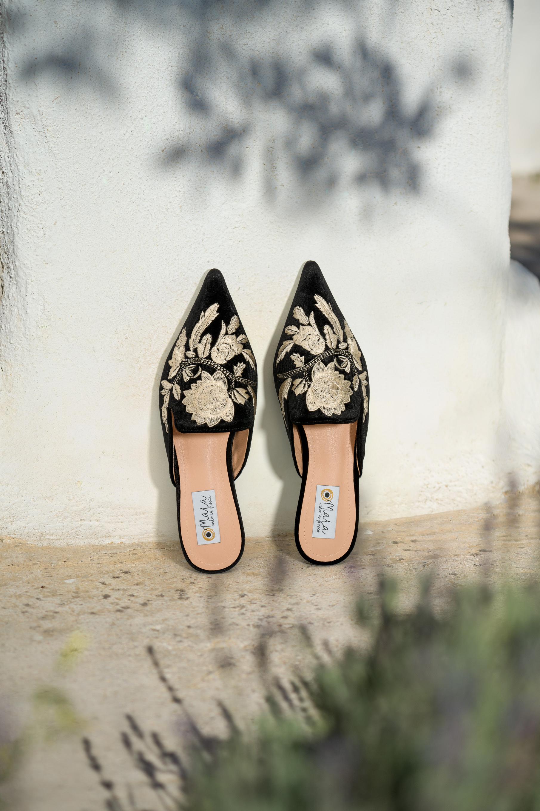 Fabricmuleswith leathertassels. Leather insoles&soles