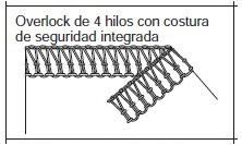 - OVERLOCK 4 HILOS: Posee puntada estándar con una puntada extra de refuerzo dentro del over, Sirve tanto para coser prendas planas como de punto. Se pueden coser remeras, buzos, calzas, trajes de baño y más.