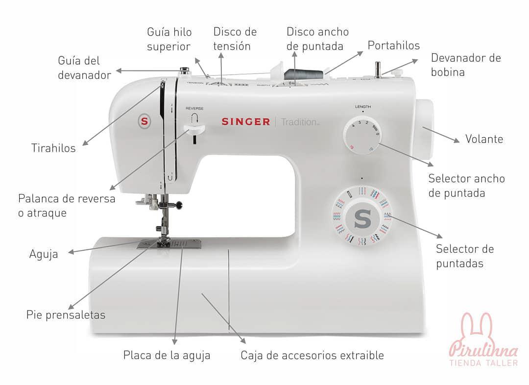 Las principales características de esta máquina de coser antigua eran una lanzadera recta, un brazo en suspensión, un prensatelas que sujetaba la tela estirada y una aguja con un ojo en el extremo más cercano a la tela. Además la máquina se accionaba mediante un pedal (toda una invención ya que hasta el momento se hacía a mano mediante una manivela).