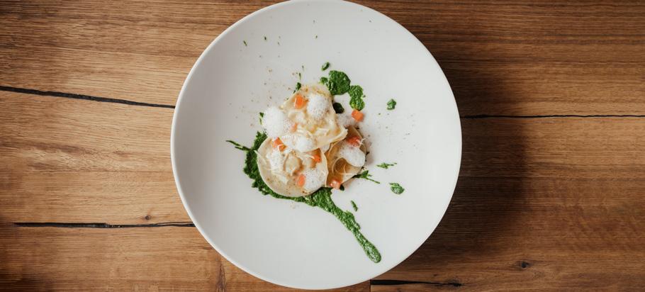 Rye “mezzelune” ravioli stuffed with ricotta cheese and porcini mushrooms on a nettle sauce, spruce air, tomato concassé and "Gran Bracun" cheese from the farm "Lüch da Pcëi"