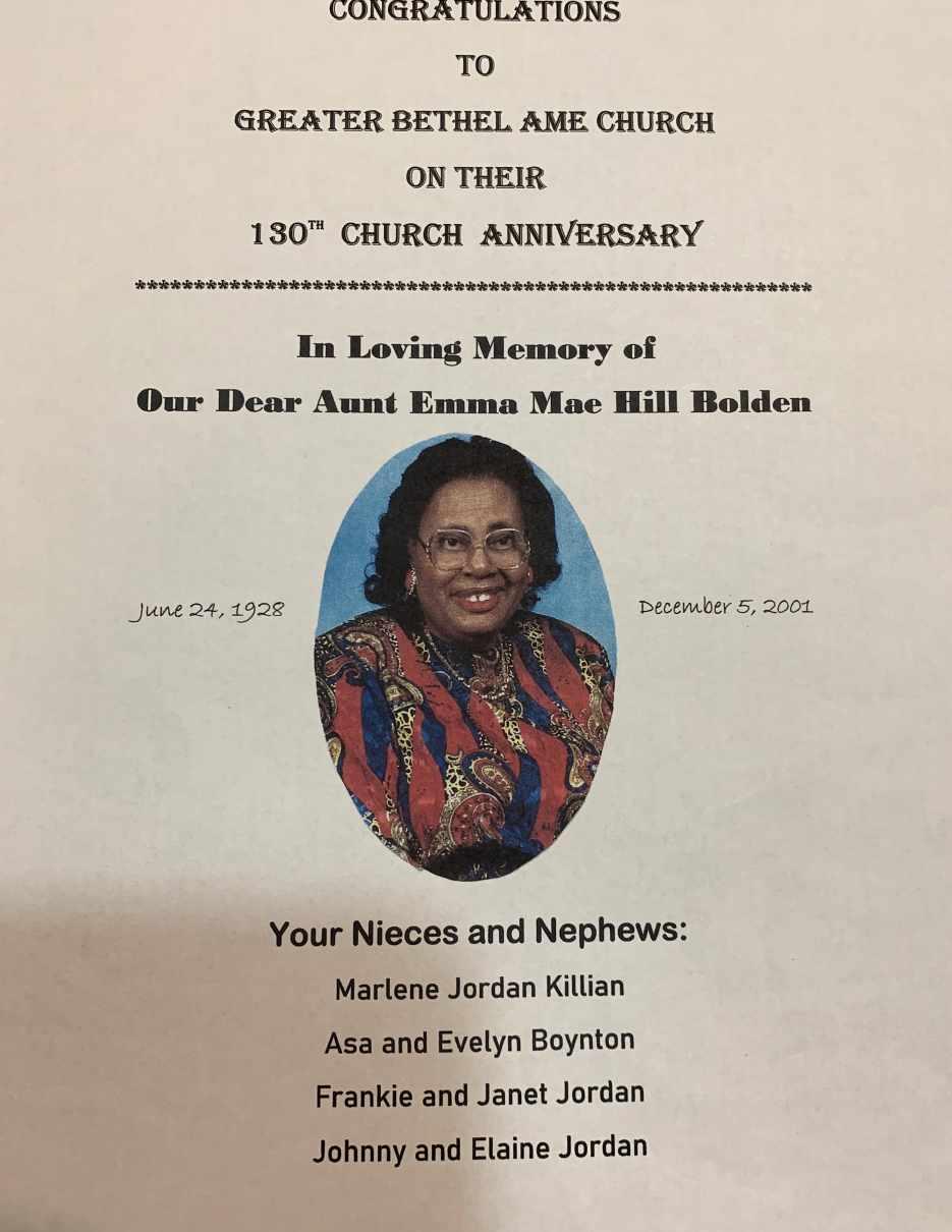 Congratulations In Loving Memory of Our Mother and Grandmother THE GREATER BETHEL AFRICAN METHODIST EPISCOPAL CHURCH AND THE MANZY FAMILY ON YOUR 130TH ANNIVERSARY