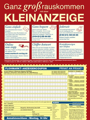 An das Gießener & Marburger Magazin EXPRESS Stichwort: »Flohmarkt«, Ernst-Giller-Str. 20a, 35039 Marburg Bitte veröffentlichen Sie meine private Kleinanzeige in der nächsten errreichbaren Ausgabe.