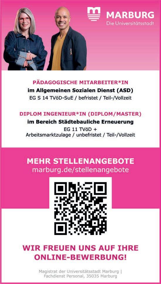 operation der Volkshochschule Marburg, des städtischen Referats für Gleichberechtigung, Vielfalt und Antidiskriminierung, der Arbeitsgruppe „Feminismus“ im „Marburger Netzwerk für Demokratie und gegen Rechtsextremismus“ und des Demokratiezentrums der Philipps-Universität. Weitere Informationen zum Programm und zur Anmeldung finden sich unter vhs-marburg.de/feminismusund-demokratie. Die Anmeldung ist bis Mittwoch, 12. November, unter Angabe des Workshop-Wunsches möglich.