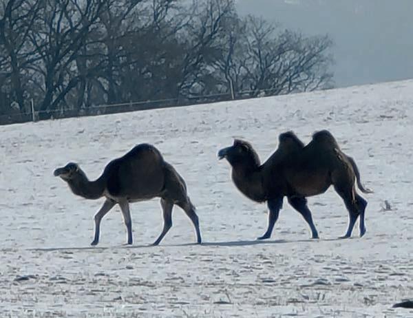Keine Fata Morgana und auch nicht KI-generiert: ein Kamel und ein Dromedar auf einem Feld zwischen Oberweimar und Germershausen. Wie sie dorthin gekommen sind, haben wir noch nicht herausgefunden - die Recherche läuft. Foto: Gesa Coordes