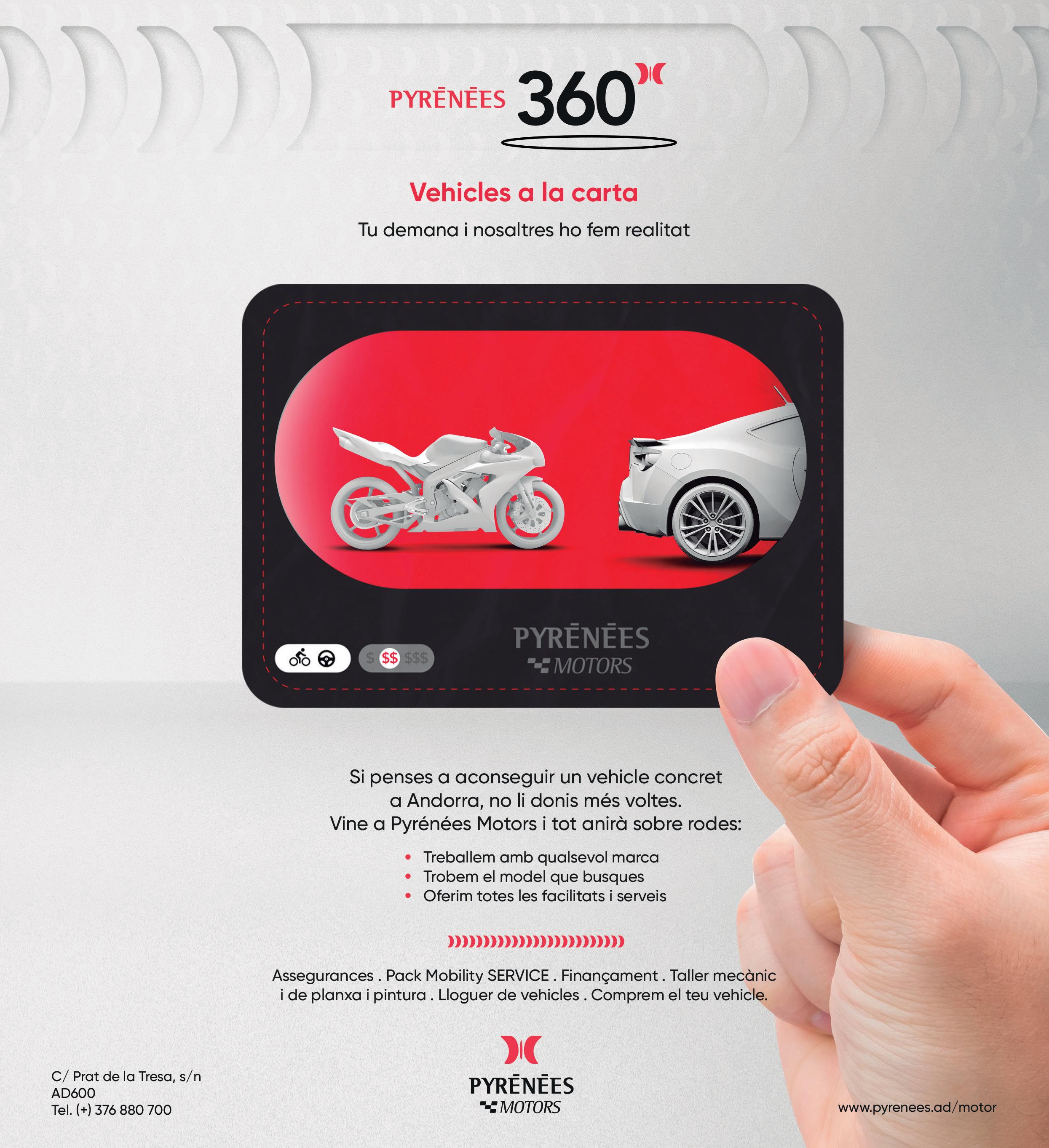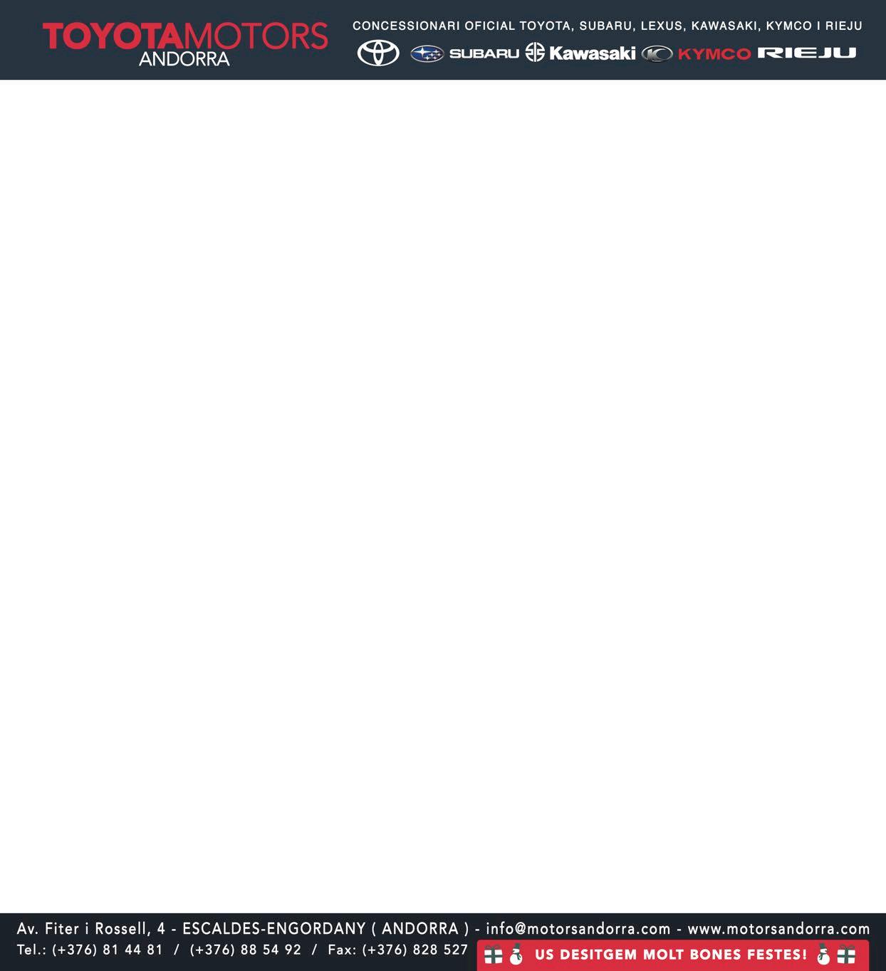 “Amés,elfetdepodertenirtoteslesmarquesenunmateixpunt, no fa més que donar valor comercial al conjunt de l’empresa, doncs tenim moltes marques, totes elles diferents i compatibles. Aixòafavoreixtenircobertsentretoteslesmarques,gairebétots els segments del mercat. Ara, si un client ve, en el mateix punt trobarà des d’un utilitari, fns a una berlina, un 4x4, un SUV de luxe, una moto o un quad, així com el parc de vehicles d’ocasió” Ja ho sabeu. A partir d’ara, trobareu Lexus Andorra a l’edifci principal de Toyota Motors. Recordeu que estan situats a l’Av. Fiter i Rossell, núm 4. Tel 814481 – 865001